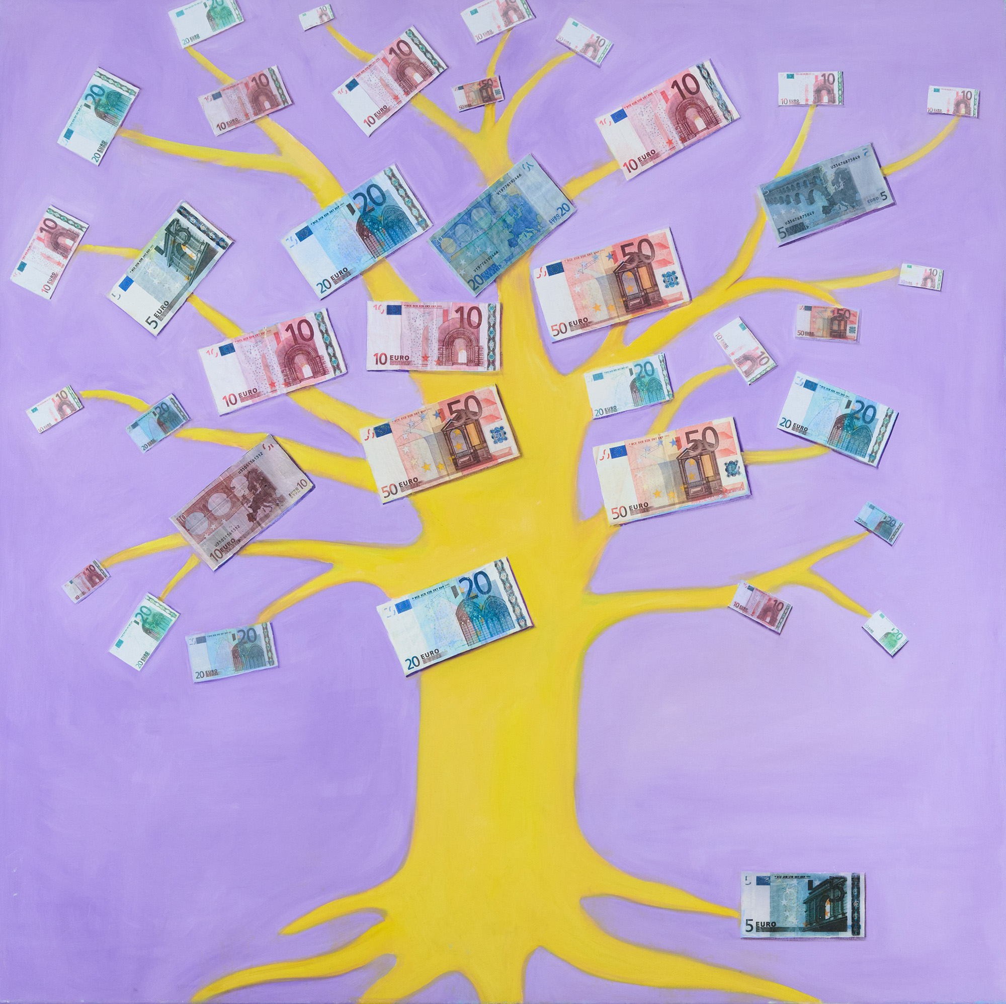 Laura Pacini (1952) L'euro, 2011 Olio e collage su tela cm. 100x100 Sul...