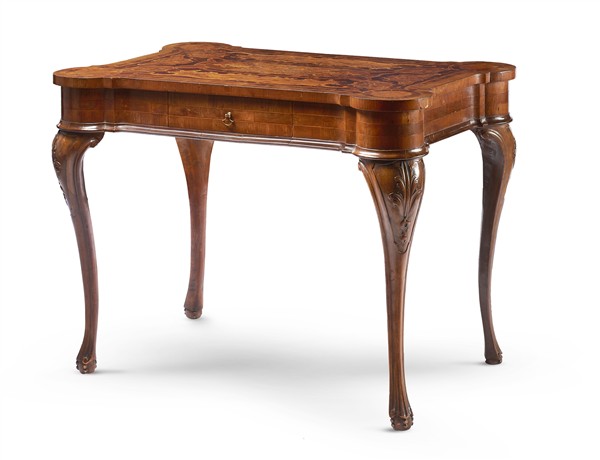 Tavolo da gioco di forma sagomata lastronato in noce, radica di noce e palissandro, filettato in legno chiaro. Piano intarsiato da cartelle sagomate e decori a volute fogliate entro bordura. Cassetto nella fascia, gambe intagliate con decoro fogliato a rilievo, piedi scanalati. Modena, secolo XVIII (cm 104x78x71) (difetti e restauri)