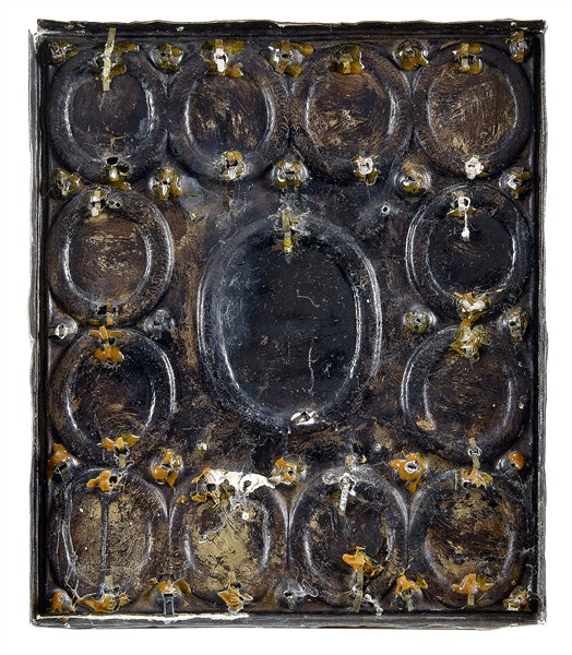 Russian art, 19th century. Icon on a silver metal board with a gilded crown decorated by coloured stones and oval plates in enamelled porcelain depicting the Resurrection of Christ at the centre of the scene and the Twelve Great Festivals with golden metal frames (cm 27x31) (defects, missing pieces and restorations)
