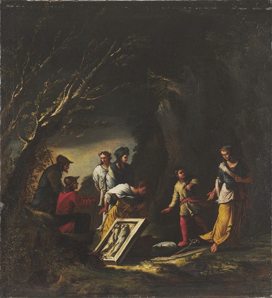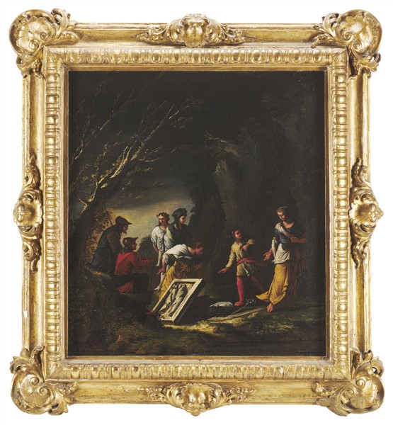 Ambito di Salvator Rosa "Paesaggio con figure intorno a un sepolcro" olio su t