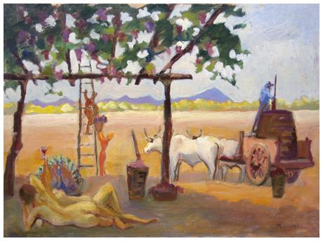 SANTI MACCHIA Pisa 1884 – 1964 Allegoria del vino Olio su cartone 26,3 x 37. Firma in b. a d. Pubbl.: “Santi Macchia” cat. mostra a cura di Silvio Guarasci, Saletta Viviani, Pisa, 3 – 31 dicembre 2005, p.40.