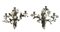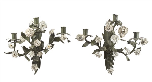 Coppia di applique a tre fiamme in ferro battuto e laccato con decoro fogliato e fiori in porcellana bianca. Piemonte, secolo XVIII (cm 38x30) (difetti)