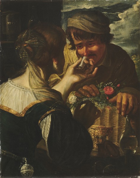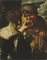 Scuola del secolo XVIII "La venditrice di profumi" olio su tavola parchettata