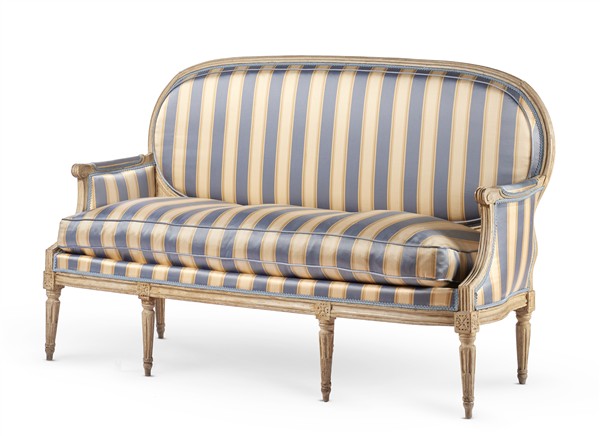 A sofa in carved and lacquered wood, seat covered in striped fabric. Late 18th century (98x154x55 cm) (defects)