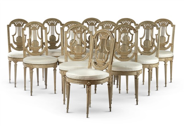 Dodici sedie in legno intagliato e laccato, schienale a giorno centrato da cartella a lira, bordure e gambe scanalate. Secolo XIX (difetti e restauri)