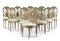 Dodici sedie in legno intagliato e laccato, schienale a giorno centrato da cart