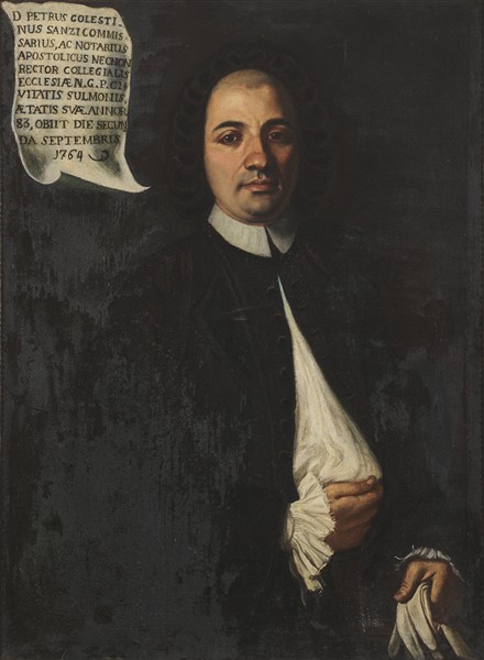 Iscritto al recto in latino: "Il reverendo Pietro Celestino Sanzio, commissario e notaio apostolico, nonché rettore della chiesa collegiale della N.G.P.C.I. della città di Sulmona, all'età di 83 anni, morì il 2 settembre 1764"