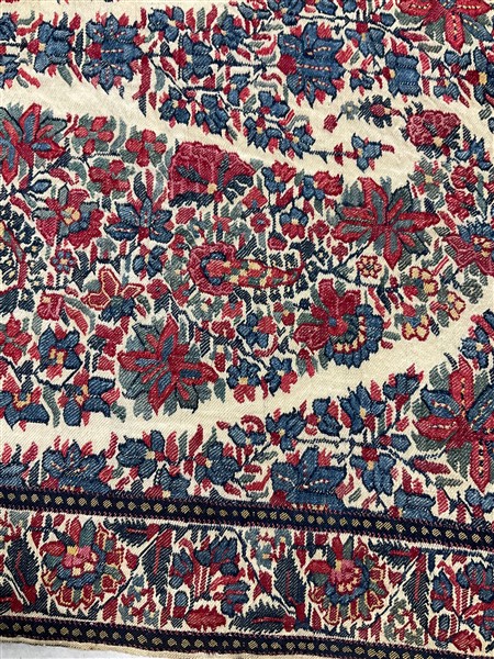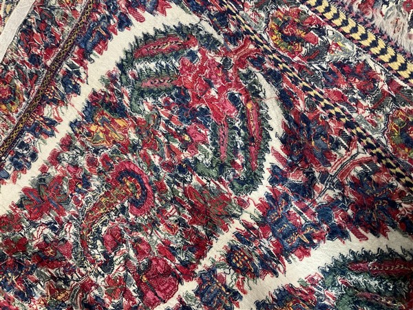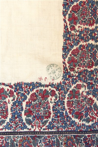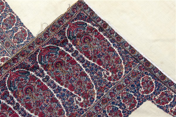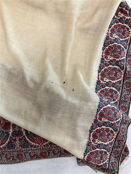 Scialle Kashmir, India, secolo XVIII-XIX. Spolinato a mano in lana. Campo a fondo bianco tinta unita delimitato da una fila di piccoli Boteh paniciuti policromi. Alle due testate una fila di Boteh panciuti con la virgola rivolta a sinistra e all'interno motivi floreali nei toni del rosso, azzurro e bianco (cm 305x130) (lievi difetti)