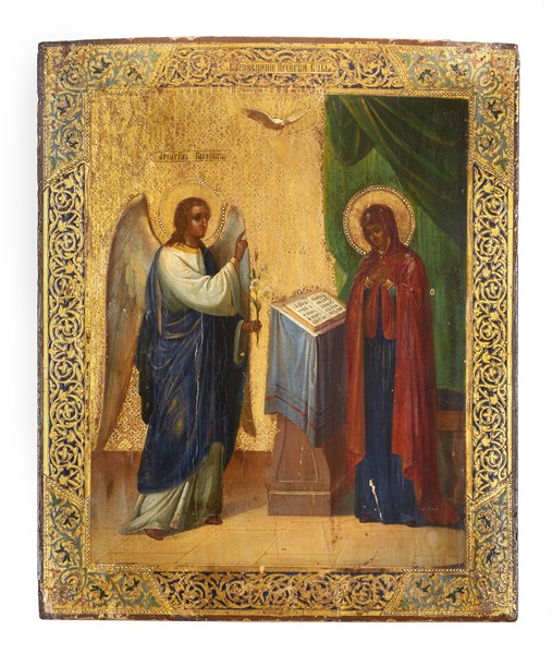 Russian art, 19th century. Icon depicting the Annunciation (cm 37x45) (defects and color drops)