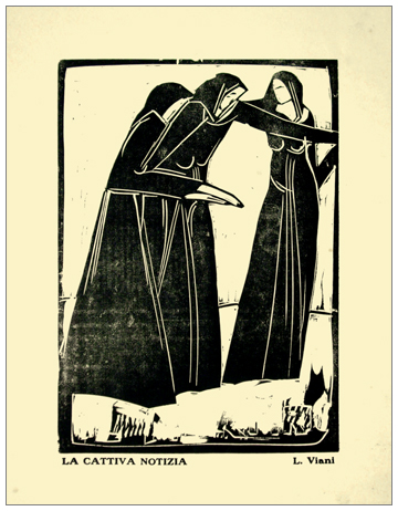 LORENZO VIANI Viareggio 1882 – Ostia 1936 La cattiva notizia Xilografia. Firma stampata in b. a d., titolo in b. a s. (50 x 35 foglio – 30 x 21 xilo.) L’opera fa parte della cartella “Il martirio” composta da 12 xilografie tratte dagli studi del quadro “La Benedizione dei morti nel mare” che l’artista fece per la Casa Comunale del suo paese (Viareggio). Opere stampate presso la tipografia O. Ciani, Viareggio, 1916.