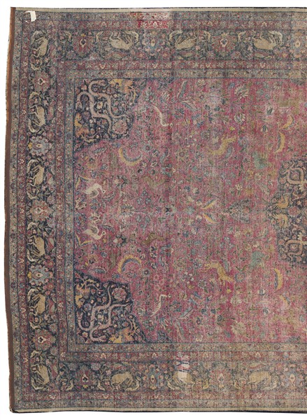 Tappeto Sarouk, Persia, prima metà del secolo XX. Decoro con medaglione polilobato con puntali a fondo azzurro e blu, ricco di una decorazione con fiori e animali policromi. Campo color rosa antico cosparso di rami fioriti, volatili e fiere. Angolari a fondo blu che riprendono la decorazione del medaglione con due serpenti contrapposti che fronteggiano due arabe fenici. Bordura principale a fondo blu decorata con motivo Herati unito con volatili e animali (cm 562x350) (difetti e rapature)