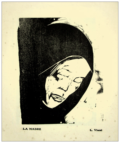 LORENZO VIANI Viareggio 1882 – Ostia 1936 La madre Xilografia. Firma stampata in b. a d., titolo in b. a s. (50 x 35 foglio – 28 x 21,5 xilo.) L’opera fa parte della cartella “Il martirio” composta da 12 xilografie tratte dagli studi del quadro “La Benedizione dei morti nel mare” che l’artista fece per la Casa Comunale del suo paese (Viareggio). Opere stampate presso la tipografia O. Ciani, Viareggio, 1916.