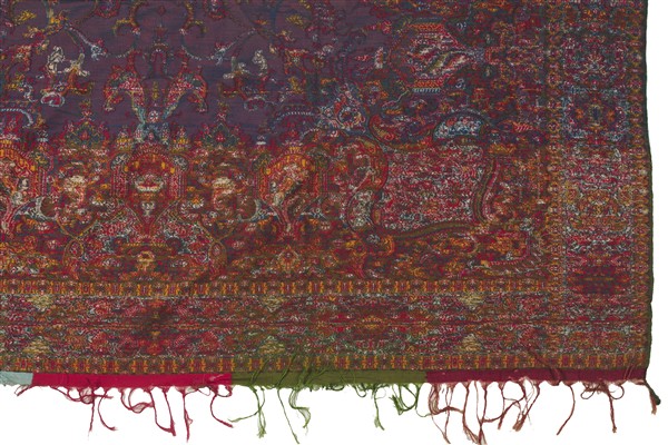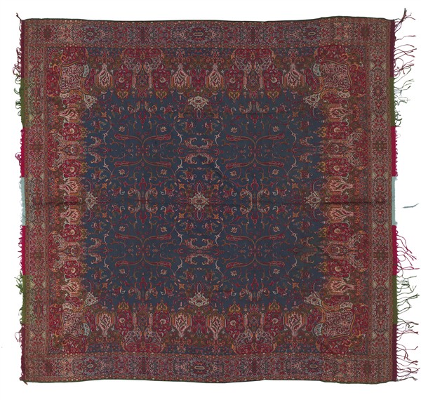 Scialle Kashmir, Inghilterra, prima metà del secolo XIX. Tessuto a mano con telaio a tiranti. Fondo del campo color carta da zucchero scuro ornato da motivi Kashmir nei toni del rosso, azzurro, verde. Grande bordura con motivi di ispirazione indiana in policromia, bordura esterna con motivi stilizzati che legano cartigli a fondo verde (cm 171x173) (lievi difetti)