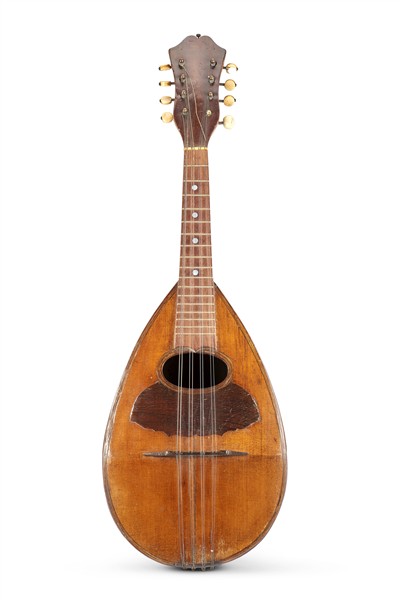 Fondo bombato di 19 doghe, manico e paletta lastronati, palette delle meccaniche in osso, una meccanica sostituita, nessuna etichetta, in discrete condizioni (lunghezza della corda vibrante mm 336)