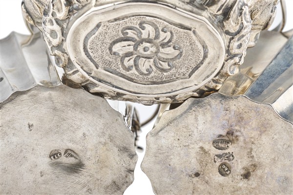 Lotto composto da tre secchielli per acqua benedetta in argento di cui una coppia costolati e uno sbalzato a volute e motivo rocaille, manici basculanti. Mantova, secolo XVIII (g 280) (h. max manico alzato cm 17) (difetti)