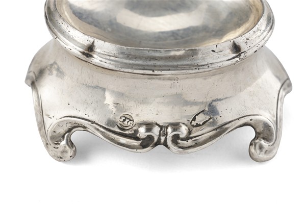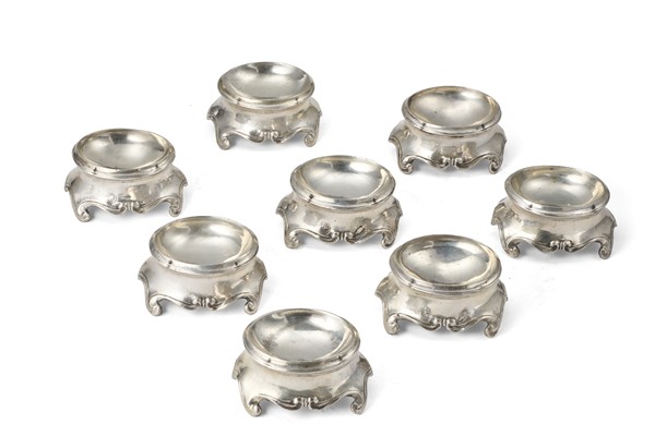 Lotto 819 | Gruppo di otto saliere in argento di forma ovale con base sagomata a volute. Ma