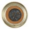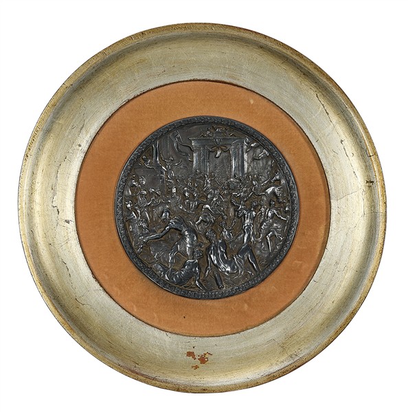 Pair of rounds in molten and chiseled silver representing: Athena leading the personification of Painting in the circle of Arts and Sciences and the Rapture of the Sabines, engraved signature "Greek" (d. cm 15) within golden frame (d. cm 30) (defects)