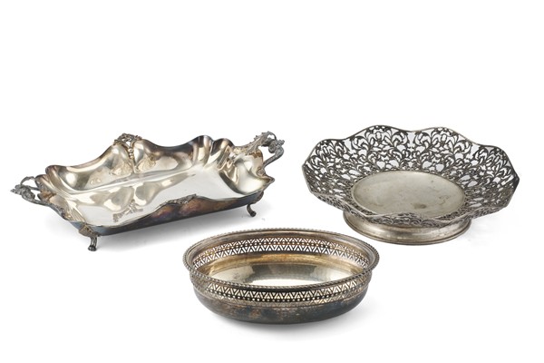 Lotto composto da tre centrotavola in argento di cui due con bordura traforata e uno biansato con piedini (g 1250) (cm max 36x21) (lievi difetti)