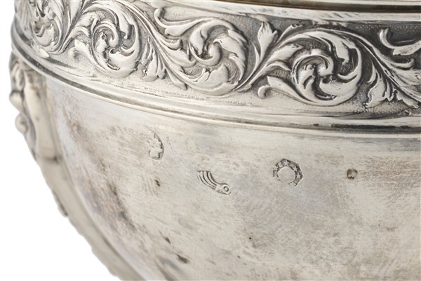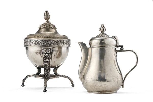 Lotto composto da zuccheriera con coperchio in argento a coppa semiglobulare su tripode con attaccature a testa di fauno, presa a pigna e una piccola cuccuma in argento liscio con coperchio incernierato. Venezia, secolo XIX (g 510) (h.cm 16) (difetti)