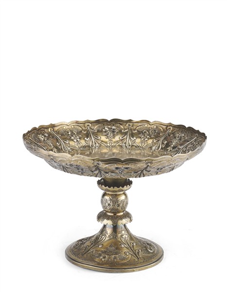 Alzata in argento sbalzato di forma circolare decorata da fiori e frutti entro volute. Sheffield, 1896. Argentieri Walker & Hall (g 950) (d. cm 26,5, h. cm 17) (lievi difetti)