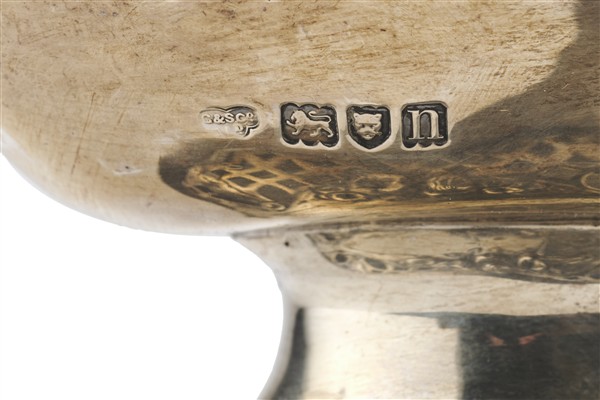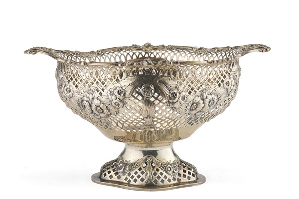 Centrotavola in argento sbalzato e traforato a coppa, decori a festoni fioriti e volute. Londra, 1908 (g 700) (cm 30x16x22) (lievi difetti)