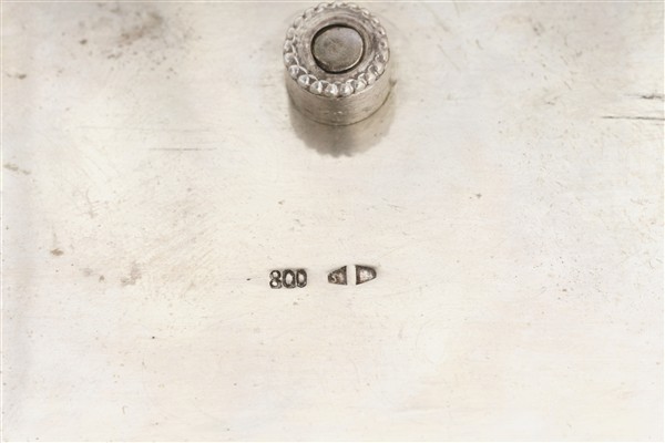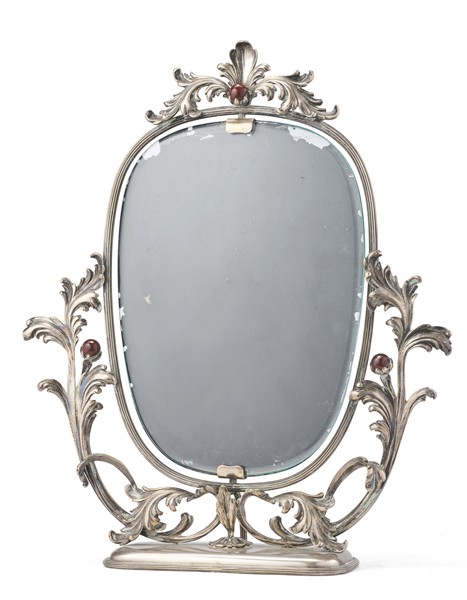 Lotto 882 | Specchio da tavola in argento sbalzato con decoro a volute fogliate e cabochon