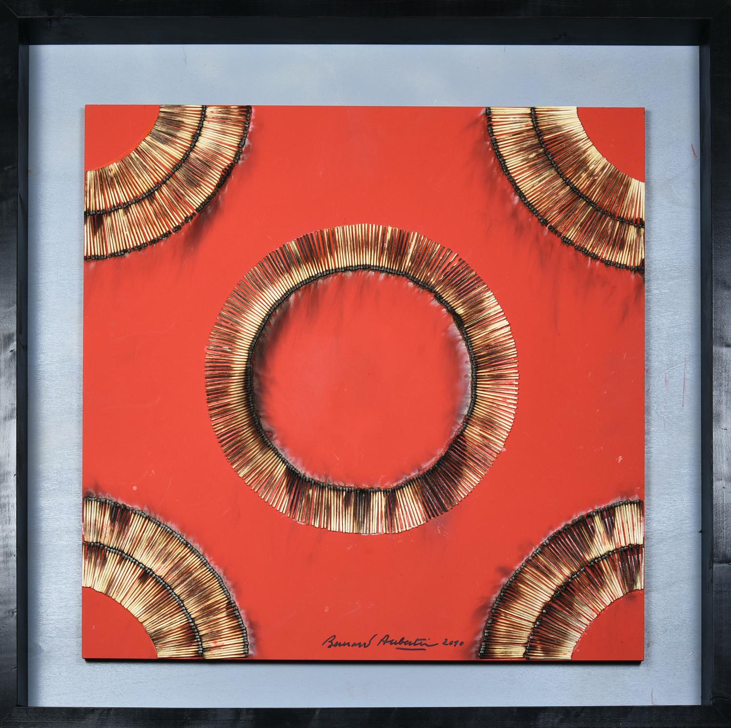 fiammiferi su tavola dipinta con acrilico rosso, cm 70x70