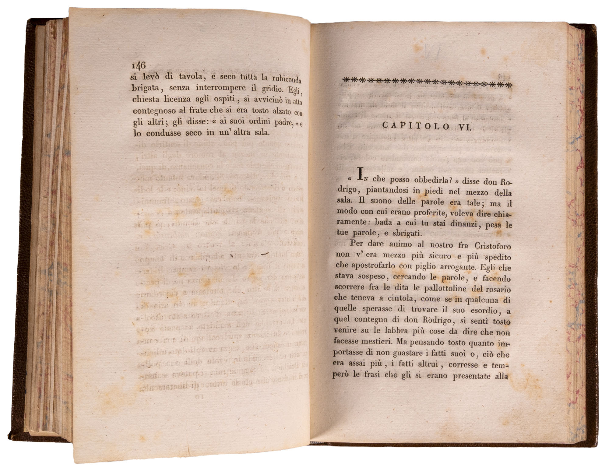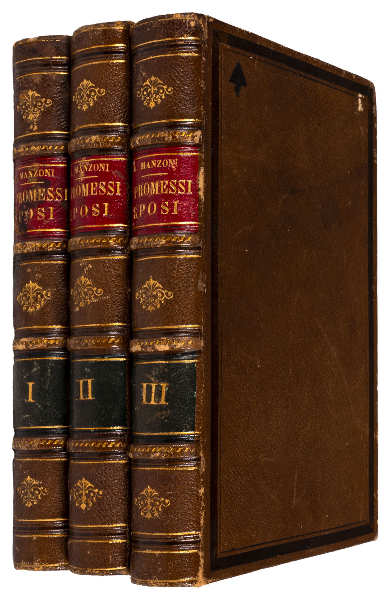 MANZONI ALESSANDRO - PROMESSI SPOSI - STORIA MILANESE DEL SECOLO XVII SCOPERTA E RIFATTA DA ALESSANDRO MANZONI1825-263 volumi, bella legatura in piena pelle, tassello con titolo e fregi oro al dorso, pp. (4),352; (4),368; (4),416,(2)In 8°, cm. 20 x 12Firma e timbro di proprietà dei precedenti possessori ai frontespizi, alle prime carte bianche del primo volume annotazioni a pennaIl nostro esemplare presenta la variante 'gioia mondana' in sostituzione della versione 'gioia carnale' (p. 330, r. 14) poi autocensurata dal Manzoni. Harris e Sartorelli sostengono che tra gli esemplari da loro censiti, quelli che recano la lezione censurata sarebbero meno numerosiL'edizione, nota come 'Ventisettana', porta la data '1825-26' È presente la variante con la lezione corretta di questa storia senza la caduta della preposizione 'di' nella frase in più d¿un luogo (p. 378, r. 13) ma venne stampata soltanto nel giugno 1827 (nel 1825 era stata avviata la stampa del primo e del secondo volume, mentre il terzo fu approntato solo nel 1826 e completato, appunto, nel giugno dell'anno seguenteOpera in condizioni generali molto buone