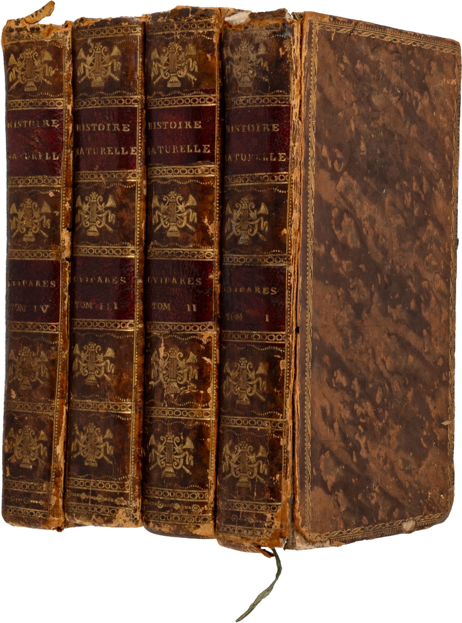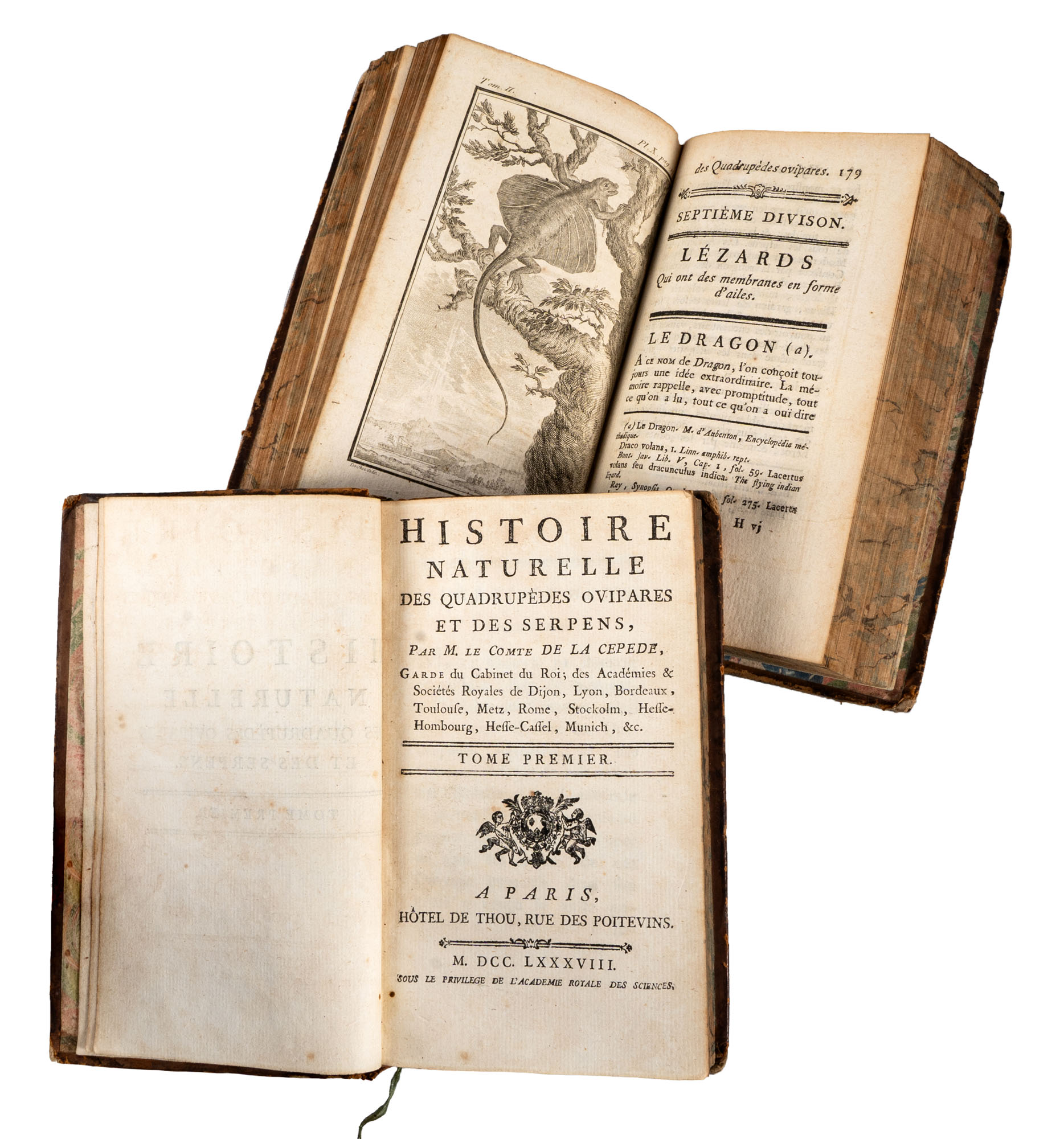PAR M. LE COMTE DE LA CEPEDE - HISTOIRE NATURELLE DES QUADRUPEDES OVIPARES ET DES SERPENSParis, Hotel de Thou, 1788 - 17904 volumi, piena pelle con fregi oro, pag. 60,359; IV,462; 24,432; 8,408, con numerose tavole fuori testo raffiguranti serpenti, tartarughe, lucertole, coccodrilli e altri rettiliIn 16°Legatura con abrasioni e mancanze, foxing su alcune pagine ma condizioni generali buone