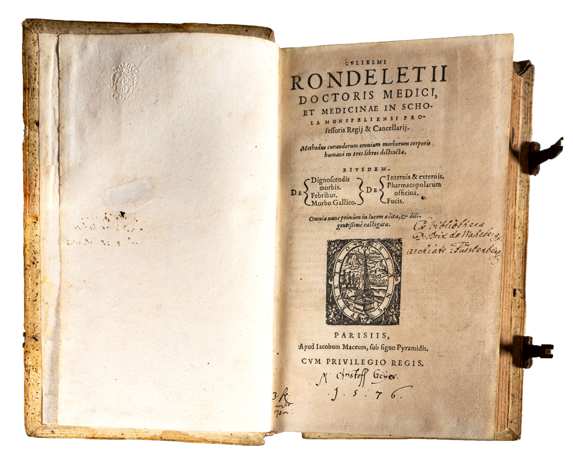 RONDELETII GULIELMI - DOCT. MEDICI, METHODUS CURANDORUM OMNIU M MORBORUM CORPORIS HUMANI IN TRES LIBROS DISTINCTA APUD JACOBUM MACEUM 1576Bella legatura in pelle di scrofa con fermagli metallici di chiusura funzionanti3 libri in uno pag. 8 + 165 + 47 + 128 + indiceIn 8°, cm. 18 x 11Condizioni generali molto buone