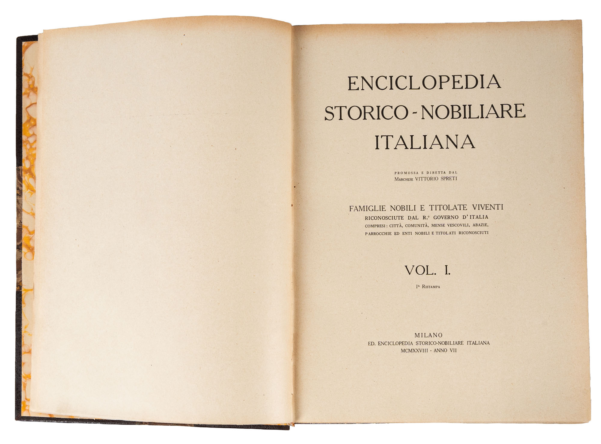 SPRETI VITTORIO - Enciclopedia storico-nobiliare italiana - Famiglie nobili e titolate viventi riconosciute dal R. Governo d'Italia, compresi: città, comunità, mense vescovili, abbazie, parrocchie ed enti nobili e titolati riconosciuti1928 / 1936; L'opera è stata pubblicata a spese dell'autoreOpera completa in 9 volumi: 6 volumi + 2 volumi Appendice Parte I e appendice Parte II + un Volume di SupplementoCentinaia di illustrazioni di stemmi nobiliari e tavole in cromolitografia a piena pagina fuori testo con velinaL'opera comprende una iconografia dei Sommi Pontefici e di Casa Savoia, un sintetico trattato di araldica, una raccolta di leggi e regolamenti in materia nobiliareCopertina in mezza pellePag. 538, 645, 713, 957, 894, 1045, 688, 767, 230 in 4°Condizioni generali molto buone