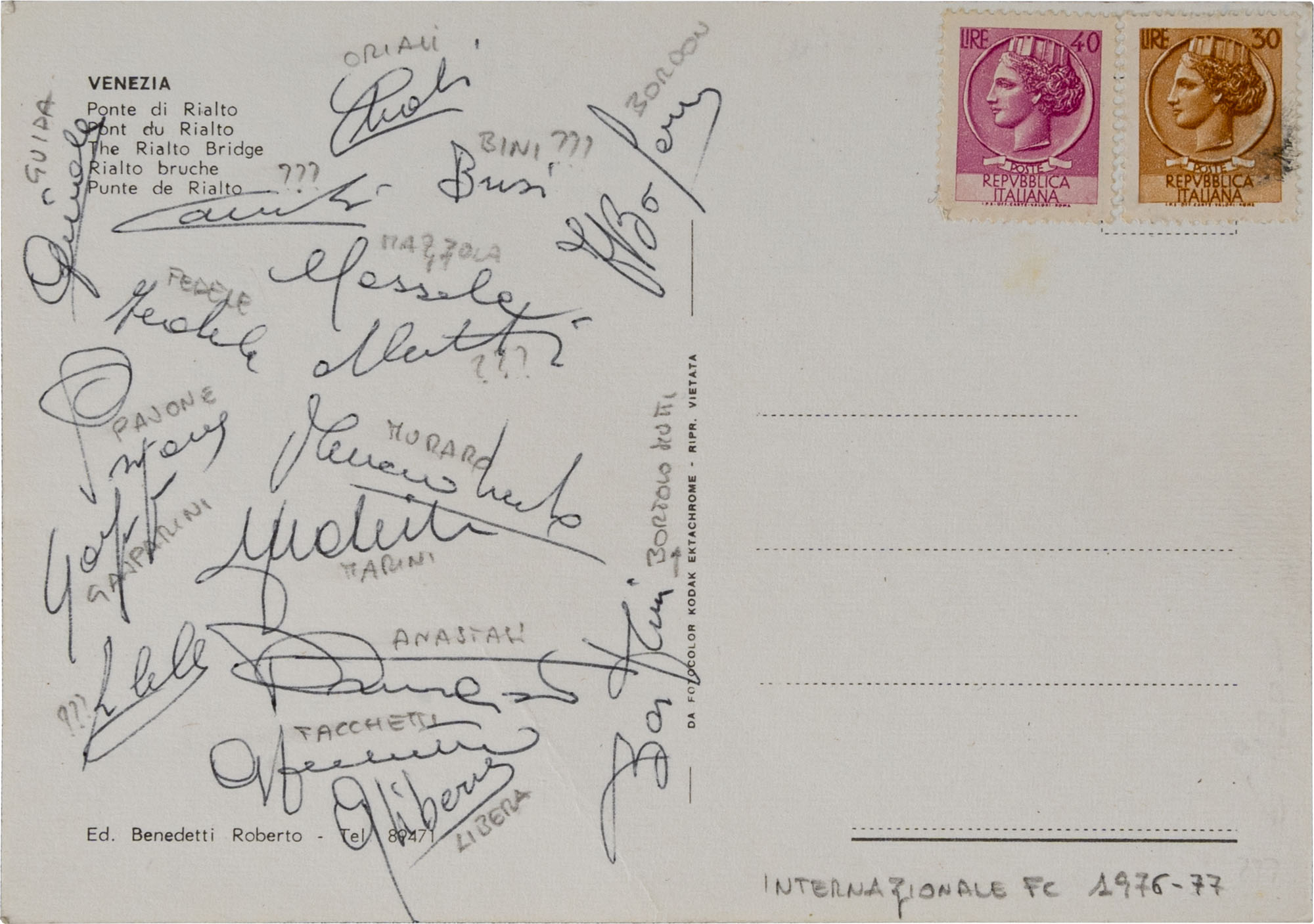 CARTOLINA CON AUTOGRAFI DEI GIOCATORI della squadra INTERNAZIONALE FC.Venezia tra il 1976 e il 1977Formato grandeSono presenti gli autografi di quasi tutti i giocatori, tra le firme riconoscibili: Mazzola, Fedele, Guida, Pavone, Facchetti, Libera, Oriali, Bordon, Marini, Muraro, Anastasi, etc.Viaggiata, condizioni generali molto buone