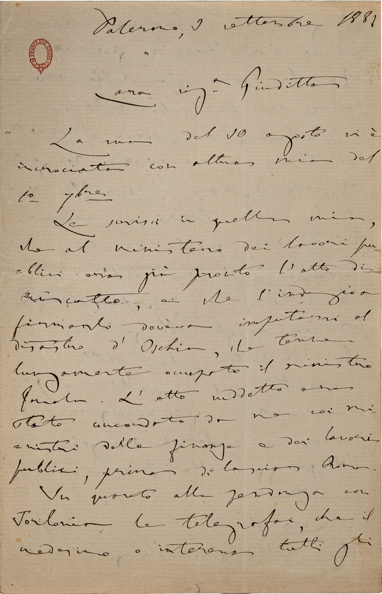 CRISPI FRANCESCO - Lettera manoscrittaDatata Palermo 9 settembre 1881Lettera...
