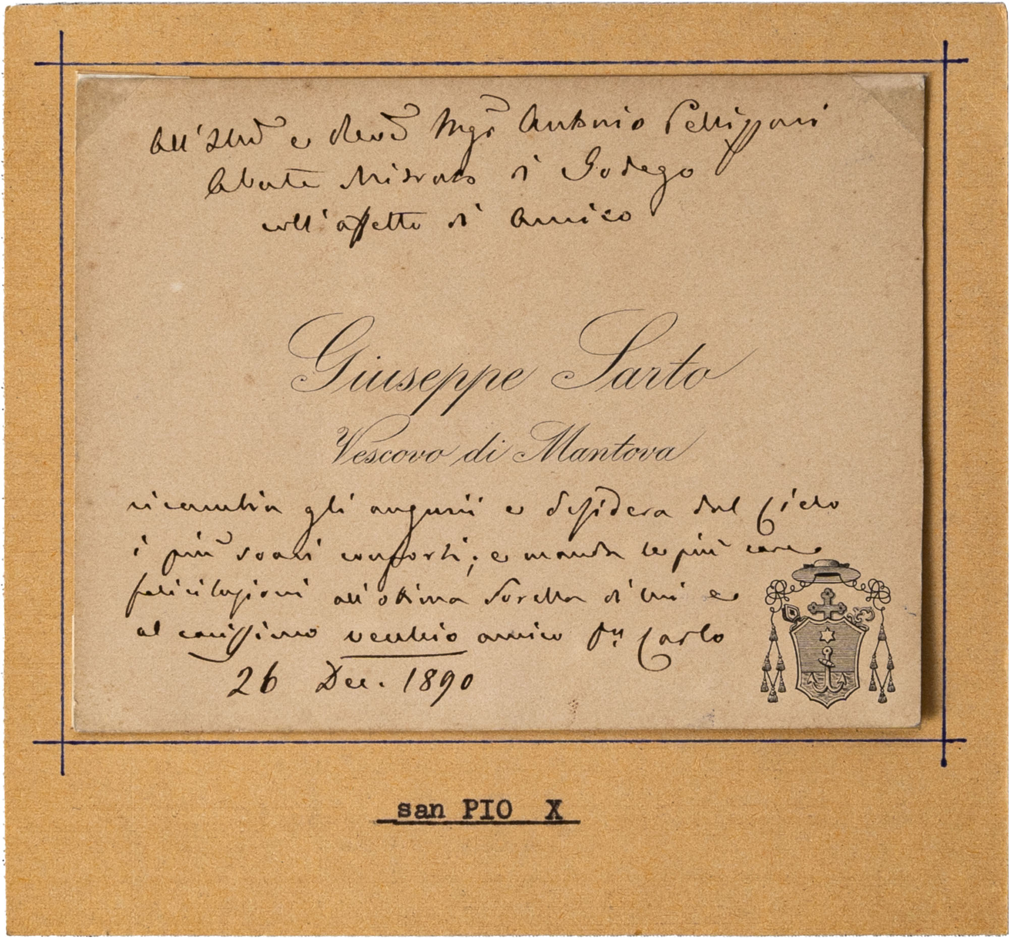 SAN PIO X GIUSEPPE SARTO VESCOVO DI MANTOVA - Biglietto da visita, con lunga dedica all'amico abate di SonegoDatato 26 dicembre 18909 x 1 cm.Pio X è stato il 257º vescovo di Roma e papa della Chiesa cattolica dal 4 agosto 1903 fino alla sua morte. Nel 1951 fu beatificato da papa Pio XII; lo stesso pontefice lo proclamò santo nel 1954Condizioni generali molto buone