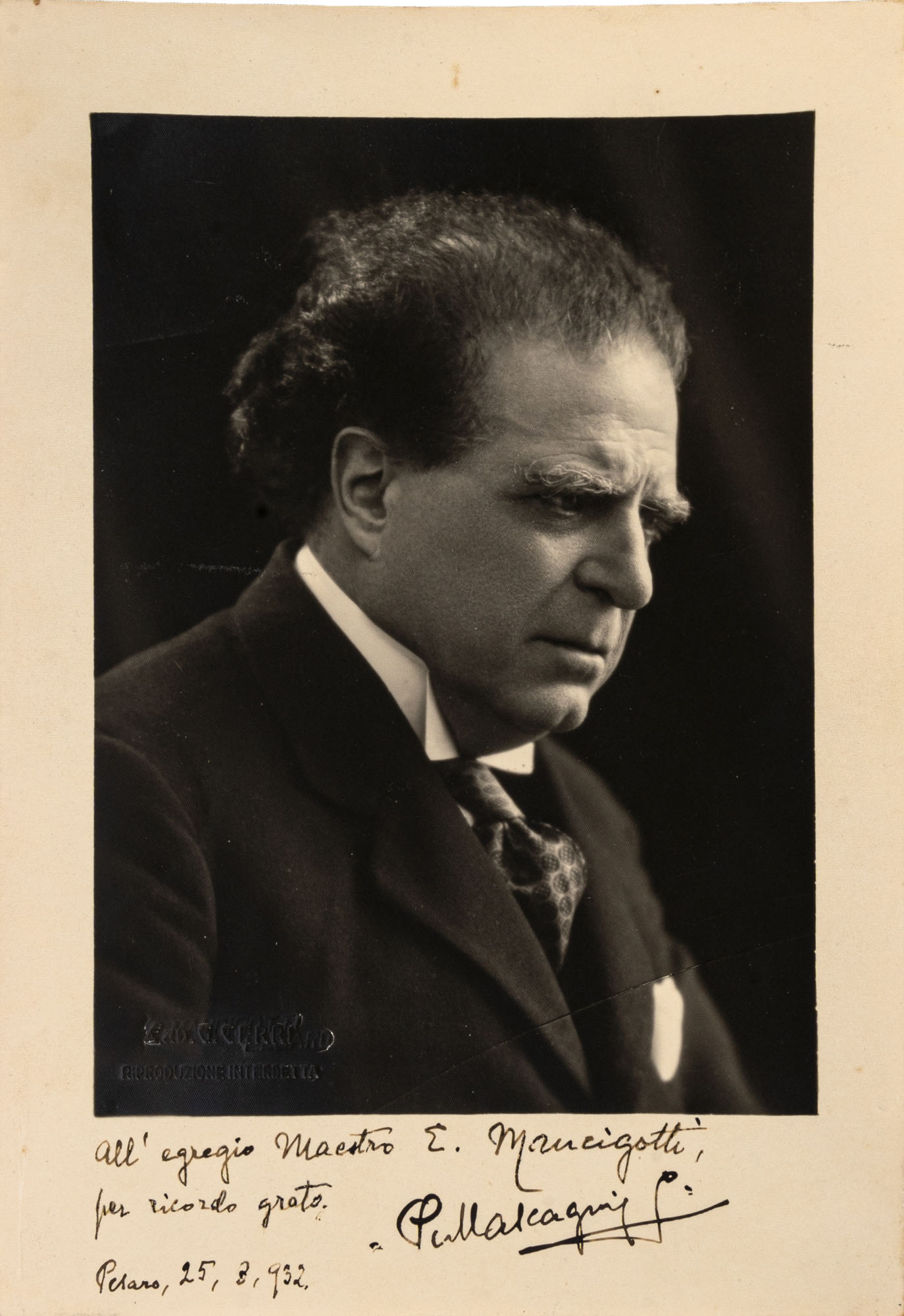 FOTOGRAFIA MASCAGNI con dedica e autografo del compositore Pietro MascagniPesaro - 193216 x 23 cm.MASCAGNI Pietro Antonio Stefano (Livorno, 7 dicembre 1863 - Roma, 2 agosto 1945) è stato un compositore e direttore d'orchestra italiano. Mascagni visse tra Ottocento e Novecento, occupando un posto di rilievo nel panorama musicale dell'epoca, soprattutto grazie al successo immediato e popolare ottenuto nel 1890 con la sua prima opera, Cavalleria rusticanaCondizioni generali molto buone