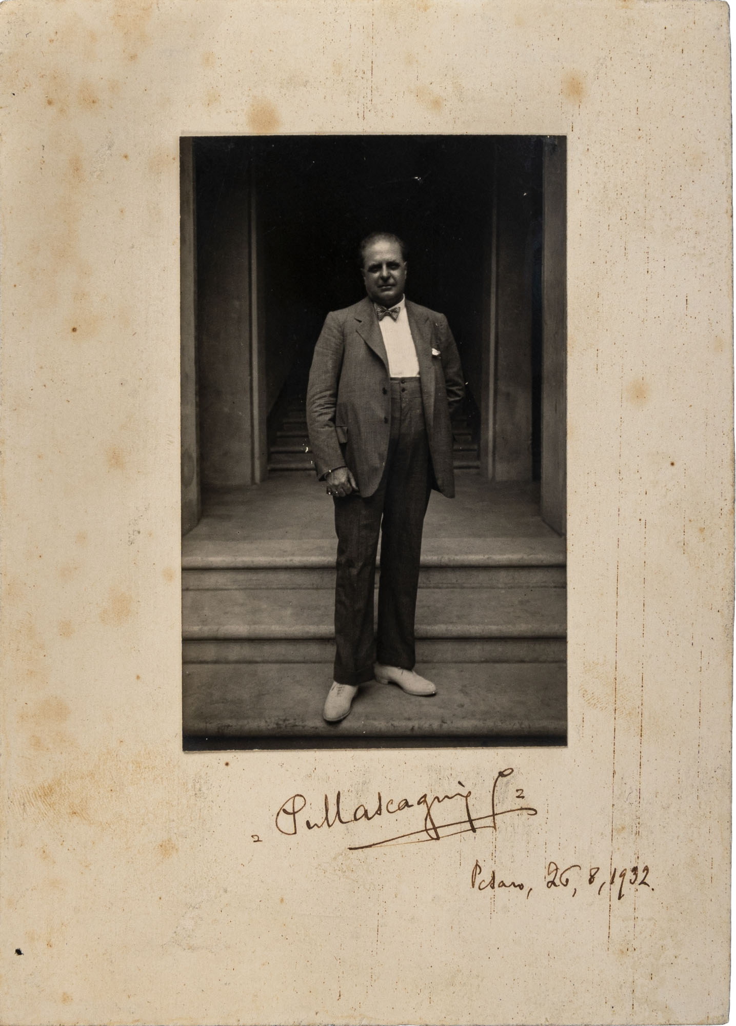FOTOGRAFIA MASCAGNI con autografo su cartoncino di supporto del compositore Pietro Mascagni1932Dimensioni foto: 9 x 14 cm.; cartoncino: 17 x 23 cm ca.Mascagni Pietro Antonio Stefano (Livorno, 7 dicembre 1863 - Roma, 2 agosto 1945) è stato un compositore e direttore d'orchestra italiano. Mascagni visse tra Ottocento e Novecento, occupando un posto di rilievo nel panorama musicale dell'epoca, soprattutto grazie al successo immediato e popolare ottenuto nel 1890 con la sua prima opera, Cavalleria rusticanaCondizioni generali molto buone