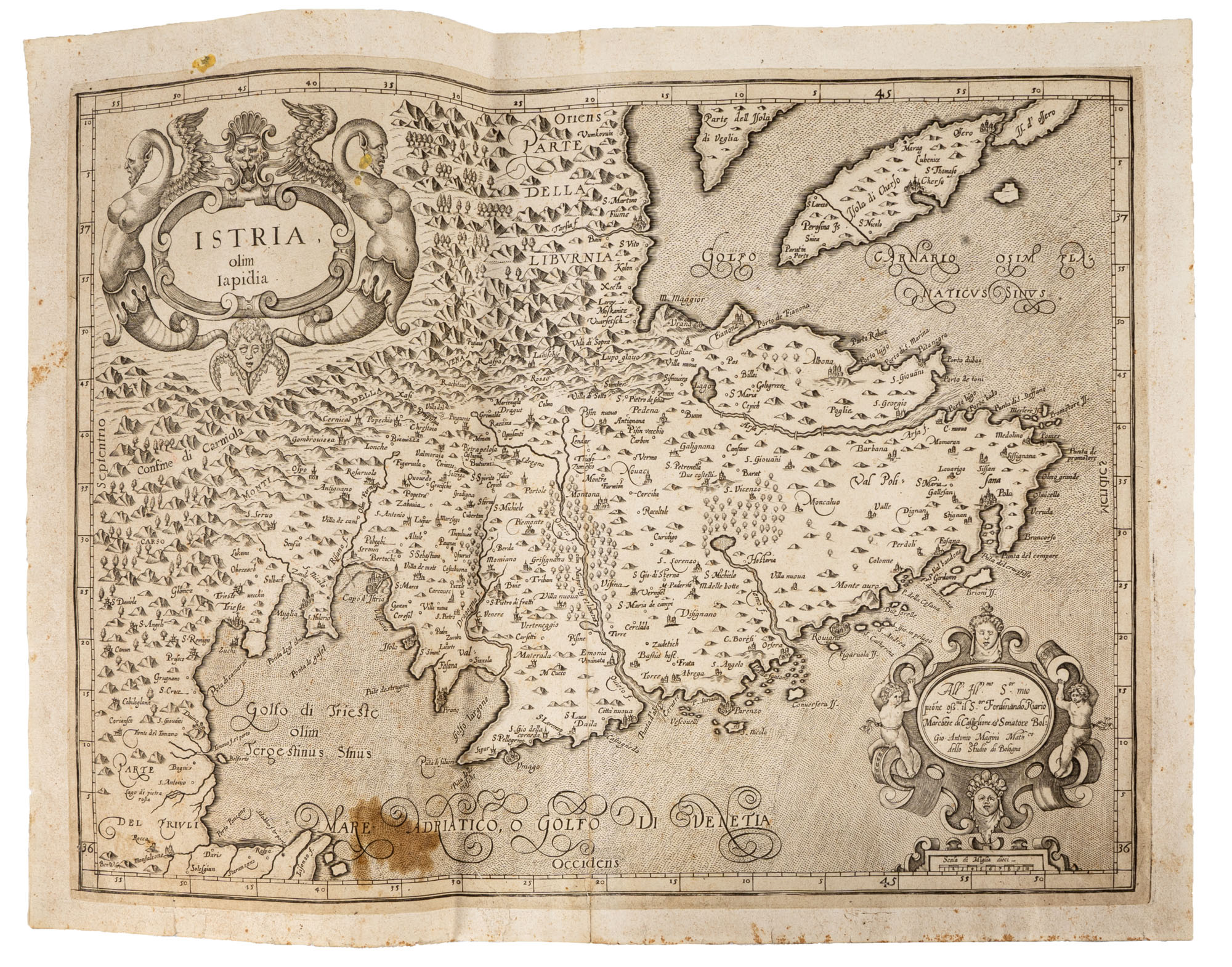 ANTICA CARTA GEOGRAFICA - ISTRIA, olim IapidiaEd. 162039 x 52 cm ca.Importante carta geografica dell'Istria disegnata da G. Antonio Magini ed inserita come trentesima mappa nel suo atlante 'Italia', stampato postumo dal figlio Fabio.Viene raffigurata la penisola istriana, con precisione ed abbondanza di toponimi; è arricchita da grande cartiglio con dedica a Ferdinando Riario, Marchese di Castiglione. Gli studiosi concordano nell'attribuire la lastra ad Arnoldo de ArnoldisCondizioni generali buone con presenza di macchia