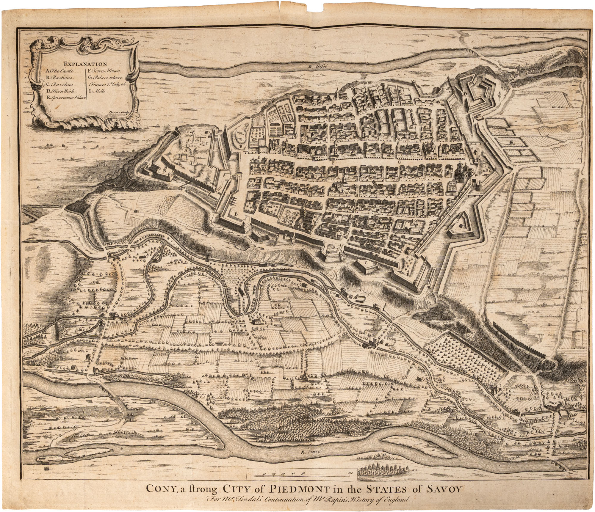 ANTICA STAMPA CUNEO - Cony, a strong city of Piedmont in the States of Savoy from Mr Tindal's continuation of Mr Rapin's History of England1750 ca.Incisione in rame di James Basire, stampata a Londra, che rappresenta la città fortificata di Cuneo lungo la valle del fiume Stura; didascalie in lingua inglese40 x 48 cm ca.Condizioni generali buone; bordi rifilati