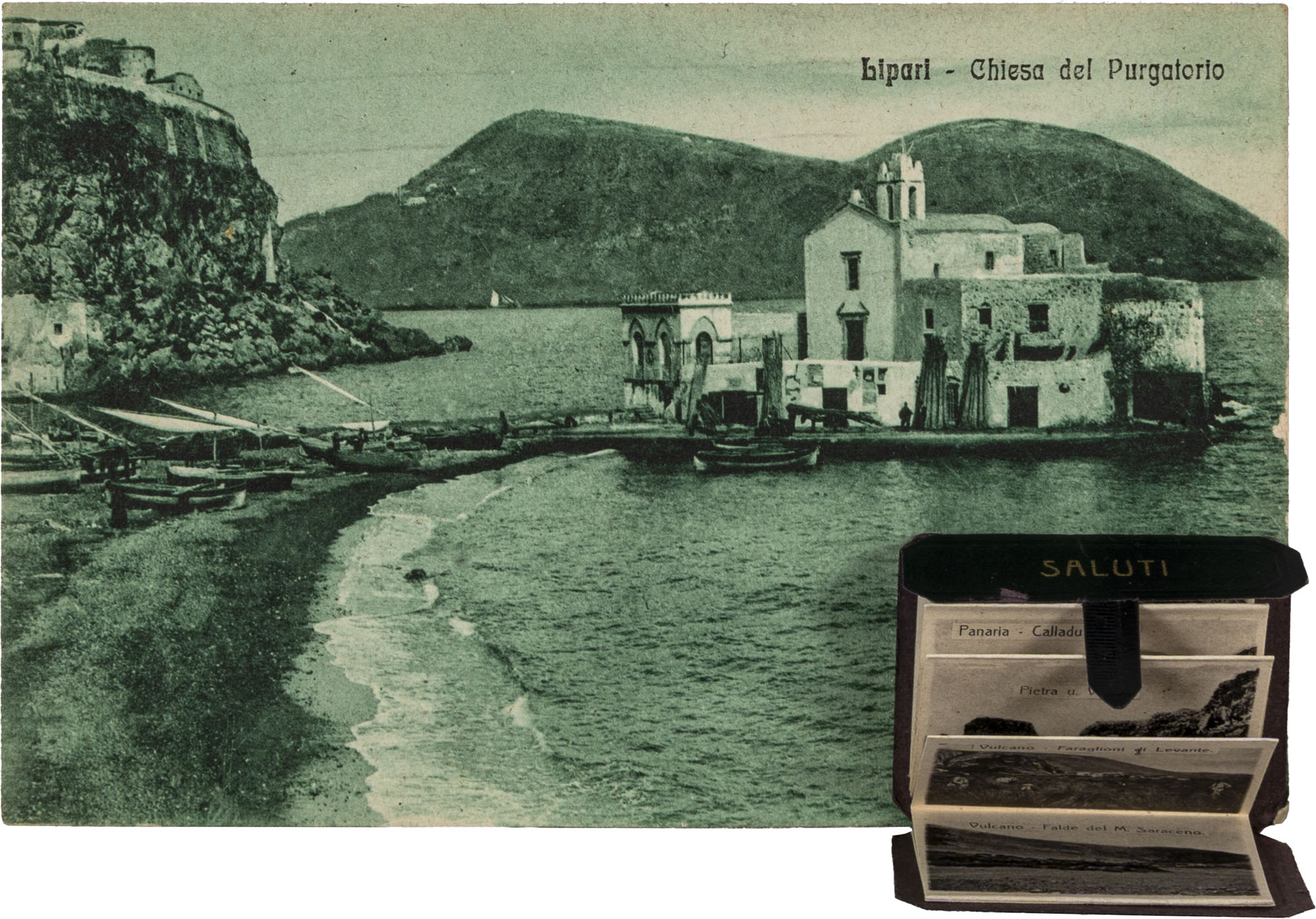CARTOLINA LIPARI - CHIESA DEL PURGATORIOViaggiata da Vulcano, 1921Formato piccoloApplicata in basso a dx, inserita in una piccolissima 'cartella', una serie di microcartoline unite a fisarmonica delle isole EolieCondizioni generali molto buone