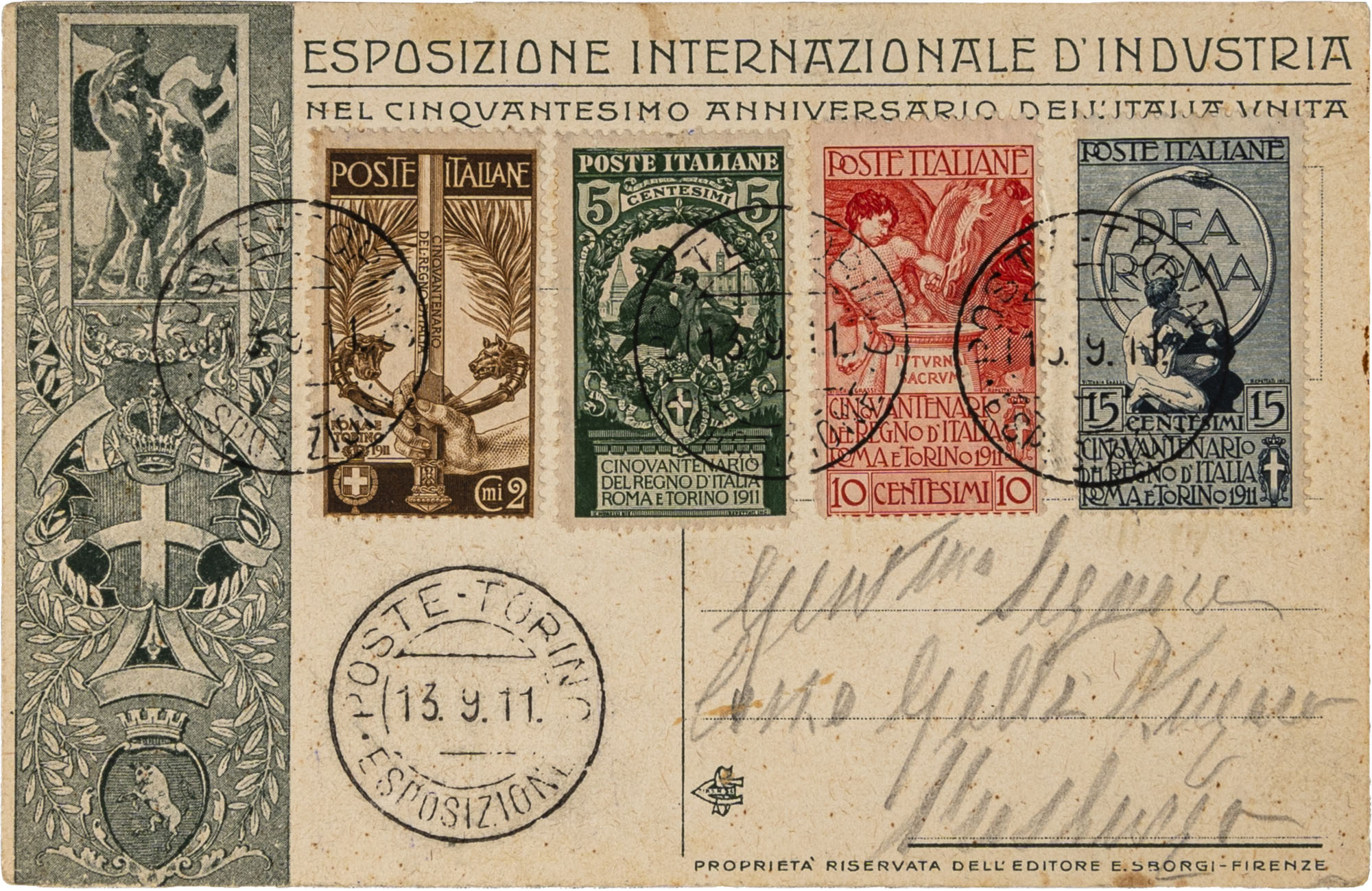 CARTOLINA TORINO - ESPOSIZIONE INTERNAZIONALE D'INDUSTRIA, NEL CINQUANTESIMO ANNIVERSARIO DELL'UNITÀ D'ITALIADatata 1911Formato piccoloAffrancata di favore, con la serie del cinquantenario; annullo con il timbro dell'esposizioneCondizioni generali molto buone