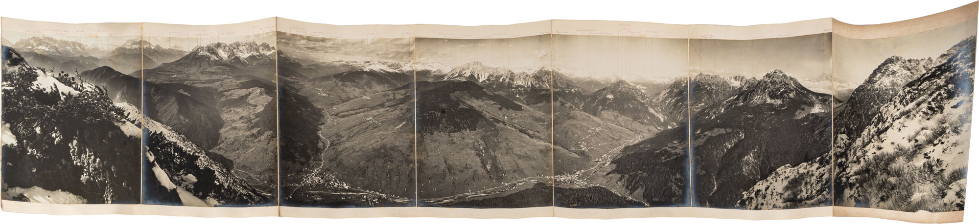 FOTOGRAFIA PANORAMICA S. STEFANO DI CADORE, Campolongo e Val Visdende dal Monte Capro (Botzer)Anni '30Fotografia panoramica (39 x 190 cm ca.) formata da 7 fotografie formato 27 x 34 cm ca. applicate su cartoncinoDidascalie manoscritteCondizioni generali molto buone
