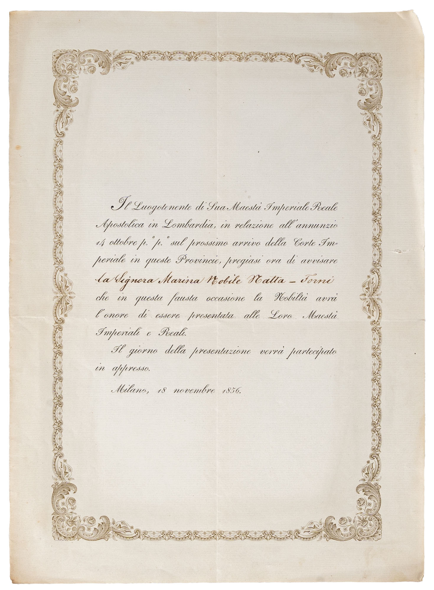 INVITO STAMPATO DI SUA MAESTÀ Imperiale Reale Apostolica in Lombardia a partecipare alla festa organizzata per l'arrivo della Corte Imperiale a MilanoMilano, 18 novembre 185630 x 22 cm. ca.Condizioni generali molto buone