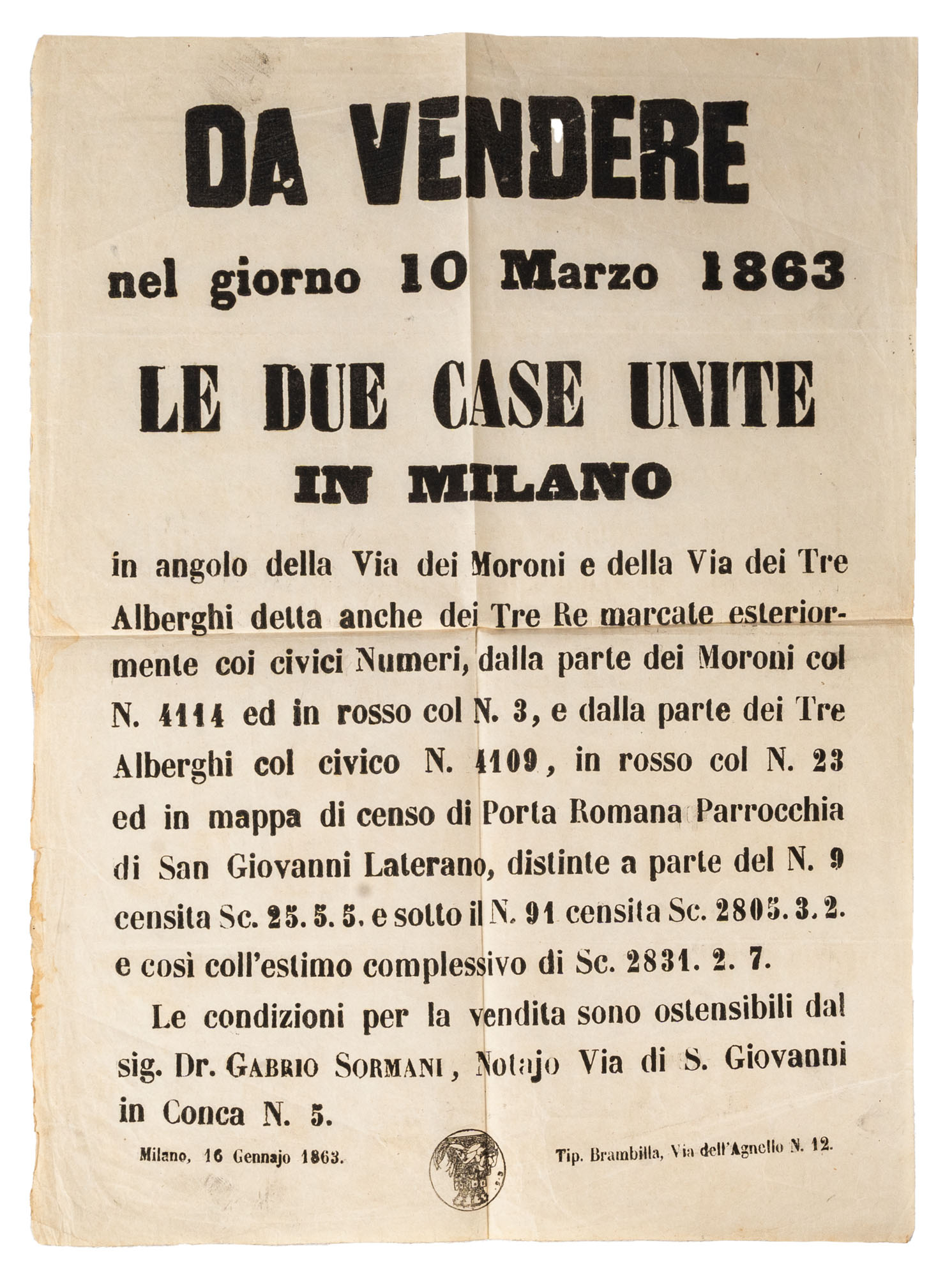 MILANO - MANIFESTO DI VENDITA IMMOBILIARE DEL 1863Milano, 16 gennaio 186342 x 31 cm. ca.'Nel giorno 10 marzo 1863 - Le due case unite in Milano. In angolo della via dei Moroni....'Condizioni generali molto buone