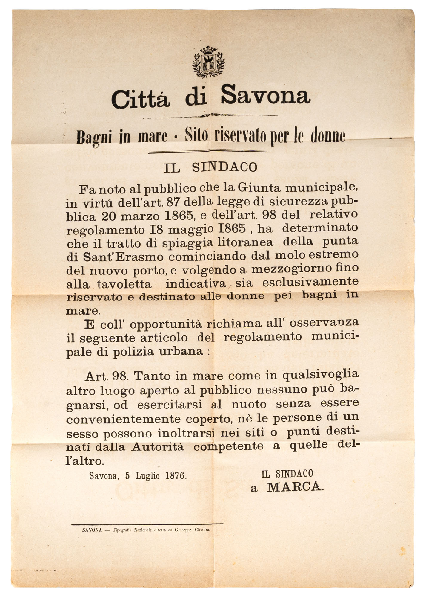 SAVONA - MANIFESTO BAGNI IN MARE SITO RISERVATO PER LE DONNESavona 5 luglio 187656 x 39 cm. ca.'Art.38. Tanto in mare come in qualsiasi altro luogo aperto al pubblico nessuno può bagnarsi, od esercitarsi al nuoto senza essere convenientemente coperto, nè le persone di un sesso possono inoltrarsi nei siti o punti destinati dalla Autorità competente a quelle dell'altro.'Condizioni generali molto buone