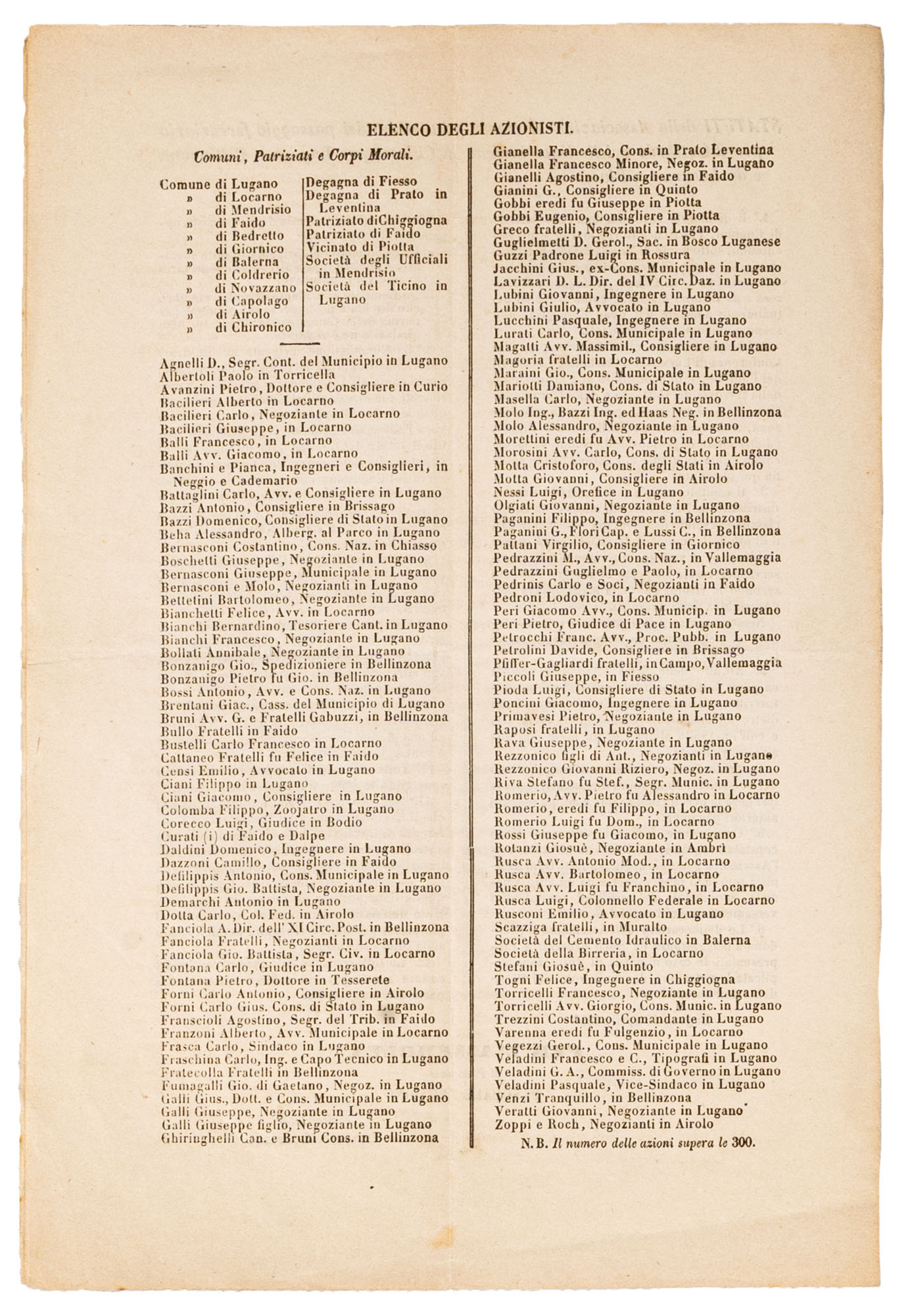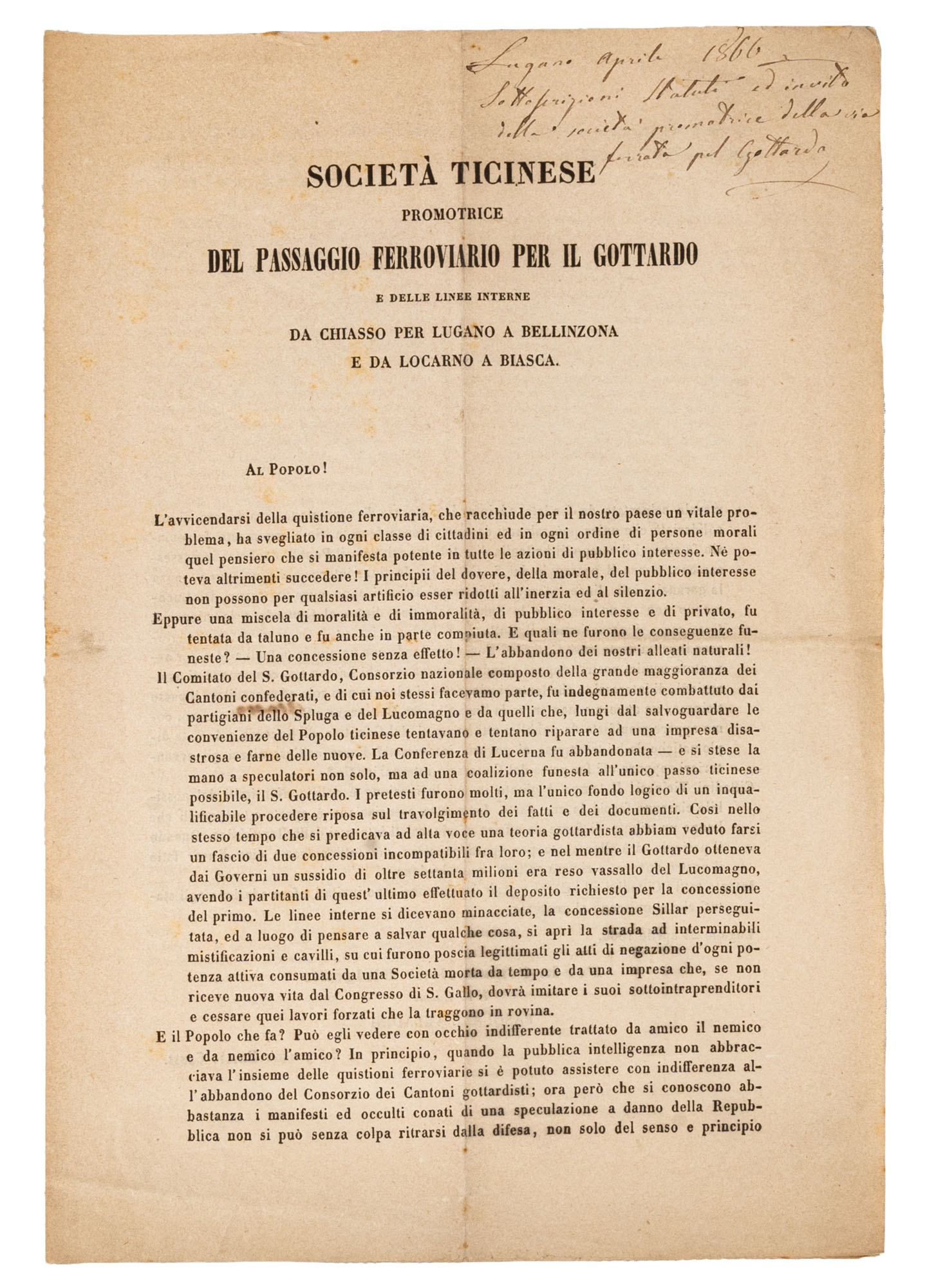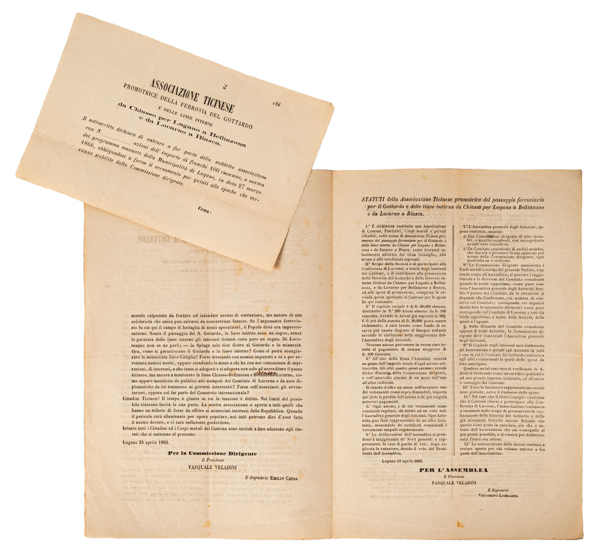 SOCIETA' TICINESE PROMOTRICE DEL PASSAGGIO FERROVIARIO PER IL GOTTARDO e delle linee interne da Chiasso per Lugano a bellinzona e da Locarno a BiascaLugano 24 aprile 1866Documento a stampa con lo Statuto dell'Associazione TicinesePresente invito a partecipare all'iniziativa, l'elenco dei sottoscrittori. e modulo in bianco di adesione per un totale di pag. 5 - Dimensioni (30,5 x 21 cm.) e (23 x 25 cm.)Condizioni generali molto buone