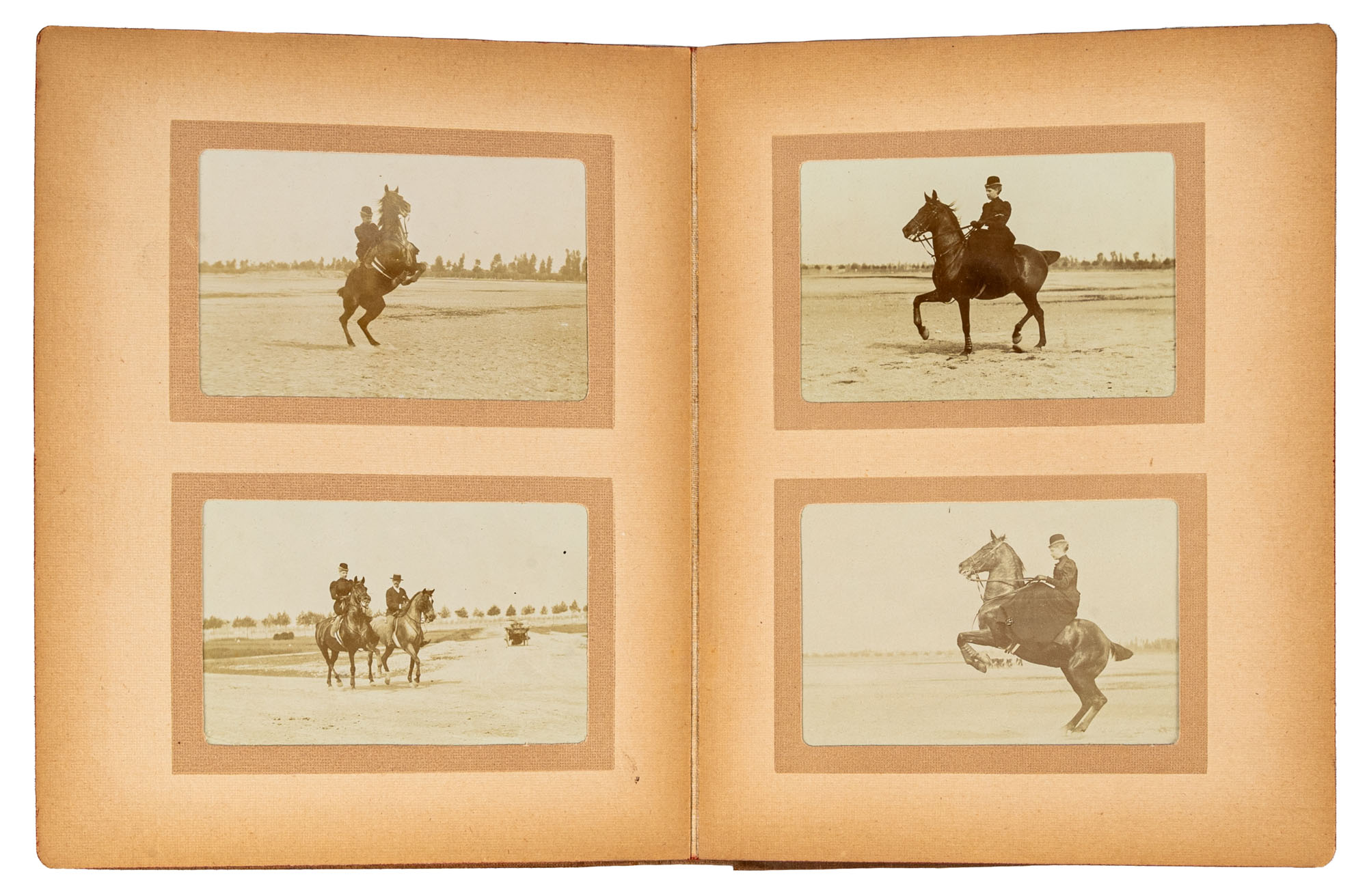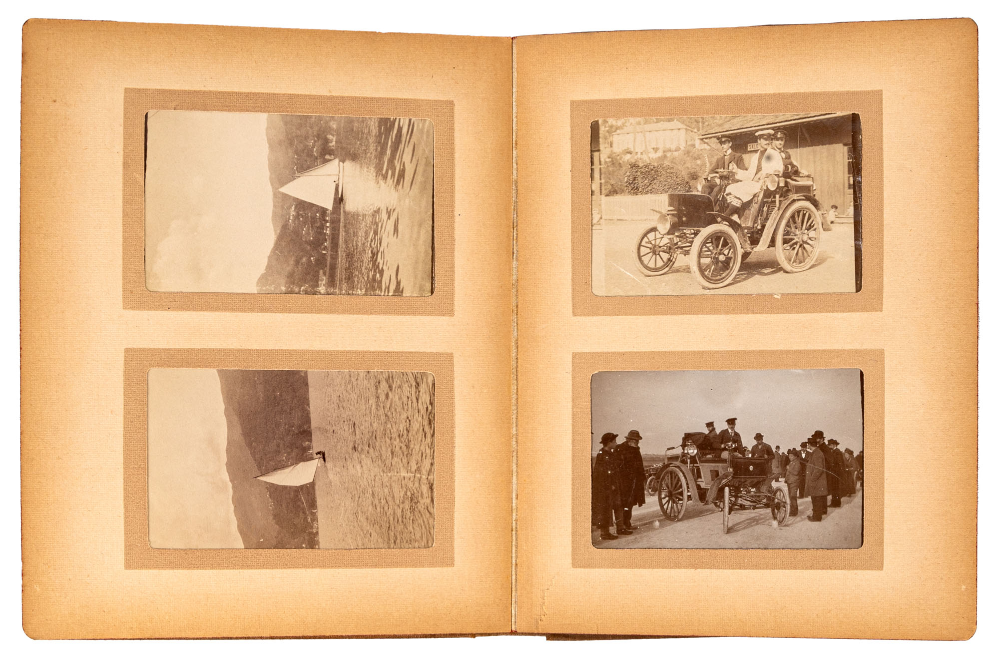 ALBUM FOTOGRAFICO - 99 IMMAGINI D'EPOCA RAFFIGURANTI VELE, AUTOMOBILI TRICICLI DA CORSA, EQUITAZIONE (DRESSAGE), LAGHI, MARE, MILANO, VENEZIA. ecc.Fotografie d'epoca tra la fine del 19° secolo e l'inizio del 20°Dimensioni fotografie 8 x 5,8 cm.Interessante spaccato del periodoCondizioni generali molto buone