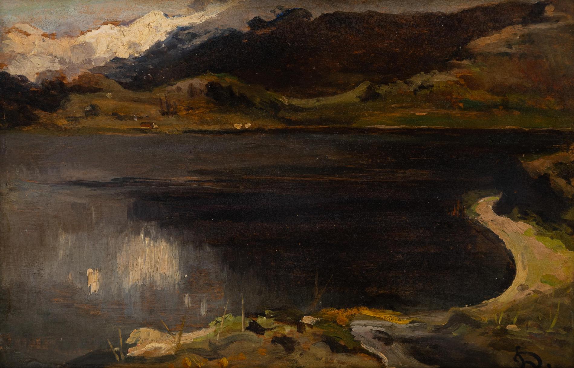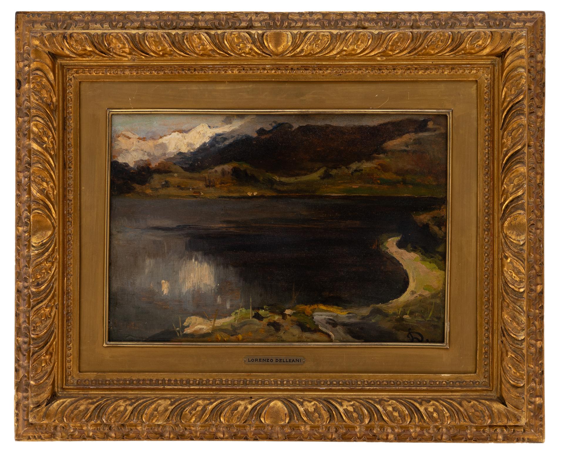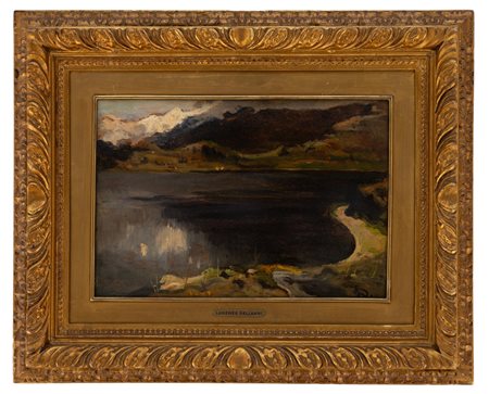 Lorenzo Delleani - All'imbrunire - Pollone (VC) 1840 - Torino 1908 - Olio su tavola cm 24x37 - Lorenzo Delleani nacque il 17 gennaio 1840 a Pollone Biellese, terzo figlio di Agostino, "misuratore competente" nel Corpo reale del genio civile, e di Maddalena Billotti. Durante gli anni di formazione presso il collegio di Saint-Jean-de-Maurienne sviluppò un interesse per la musica e il violino, ma fu lo zio materno, Pietro Antonio Billotti (1792-1878), a indirizzarlo verso la pittura, passione condivisa anche dal fratello minore Cesare.Nel 1854 si iscrisse all'Accademia Albertina di Torino, studiando con E. Gamba e successivamente con C. Arienti e A. Gastaldi. Esordì nel 1855 alla mostra della Società Promotrice di Belle Arti con l'acquarello "Testa di vecchio". Durante questi anni, si distinse con opere di soggetto storico come "Episodio dell'assedio di Ancona" (1860) e "Ulisse riconosciuto dal suo vecchio cane Argo". Nel 1863 vinse il primo premio dell'Albertina con "Studio di figura dal vero rappresentante Sordello", consolidando la sua reputazione.Le sue prime opere rispecchiano uno stile accademico-romantico con tagli scenografici e attenzione alla ricostruzione storica. Tuttavia, dal 1868 si orientò verso il paesaggio en plein air, con opere come "Spiaggia presso Genova", caratterizzate da un approccio più immediato e da un tocco pittorico meno rigido.Attivo nella vita culturale torinese, nel 1869 aderì alla società d'artisti "L'Acquaforte" e strinse amicizia con il poeta G. Camerana. Il suo viaggio a Venezia nel 1873 rafforzò l'interesse per la pittura tonale e la lezione dei maestri veneziani, influenze che si riflettono nelle sue opere degli anni Settanta. Durante questo periodo produsse sia vedute paesaggistiche sia opere di gusto orientalista, come "Tappeti da vendere" (1880) e "Fuciliere arabo a cavallo" (1881), dimostrando un interesse per l'esotismo in linea con la moda dell'epoca.Nel 1883 visitò l'Olanda con Camerana, un'esperienza che influenzò la sua tavolozza e il suo approccio alla luce. Da allora, incrementò la produzione di tavolette e paesaggi ispirati alle campagne piemontesi e alle vedute liguri. Senza un netto distacco dalla pittura storica, si concentrò progressivamente su scene di vita quotidiana e paesaggi vibranti di luce.Partecipò a numerose esposizioni: la III Esposizione nazionale italiana di Napoli (1877), la I Triennale di Milano (1891) e la I Biennale di Venezia (1895), continuando a esporre fino al 1907. Nel 1900 due sue opere furono presentate alla Mostra Universale di Parigi. Nel 1902 fu tra i promotori dell'Esposizione Internazionale di Arte Decorativa Moderna di Torino.Morì a Torino il 13 novembre 1908. La sua ultima opera, "Cuneo dalla Madonna della Riva", fu autenticata dall'amico scultore Leonardo Bistolfi, che gli dedicò anche un ritratto in gesso e una lapide commemorativa nel cimitero di Pollone Biellese.