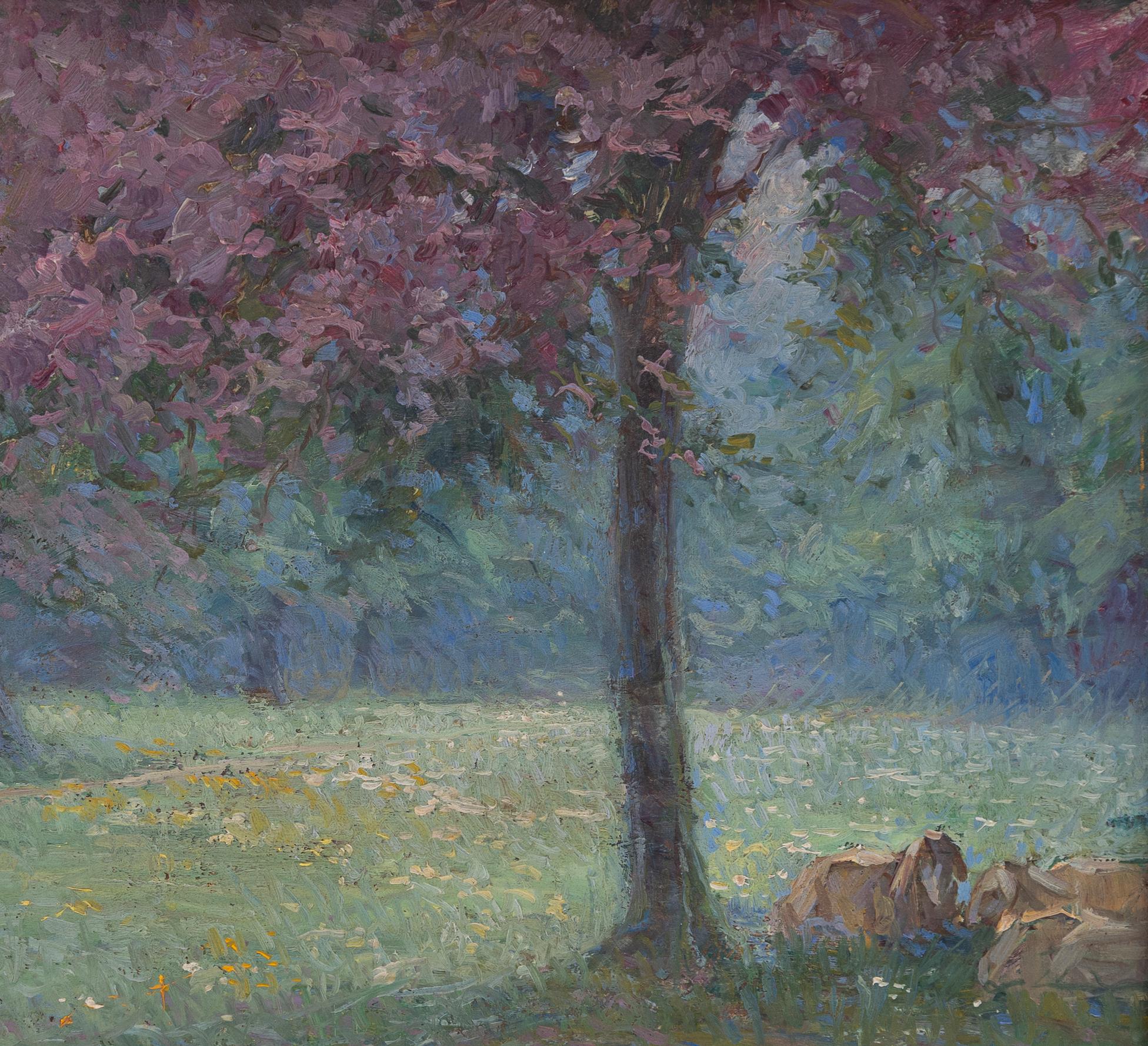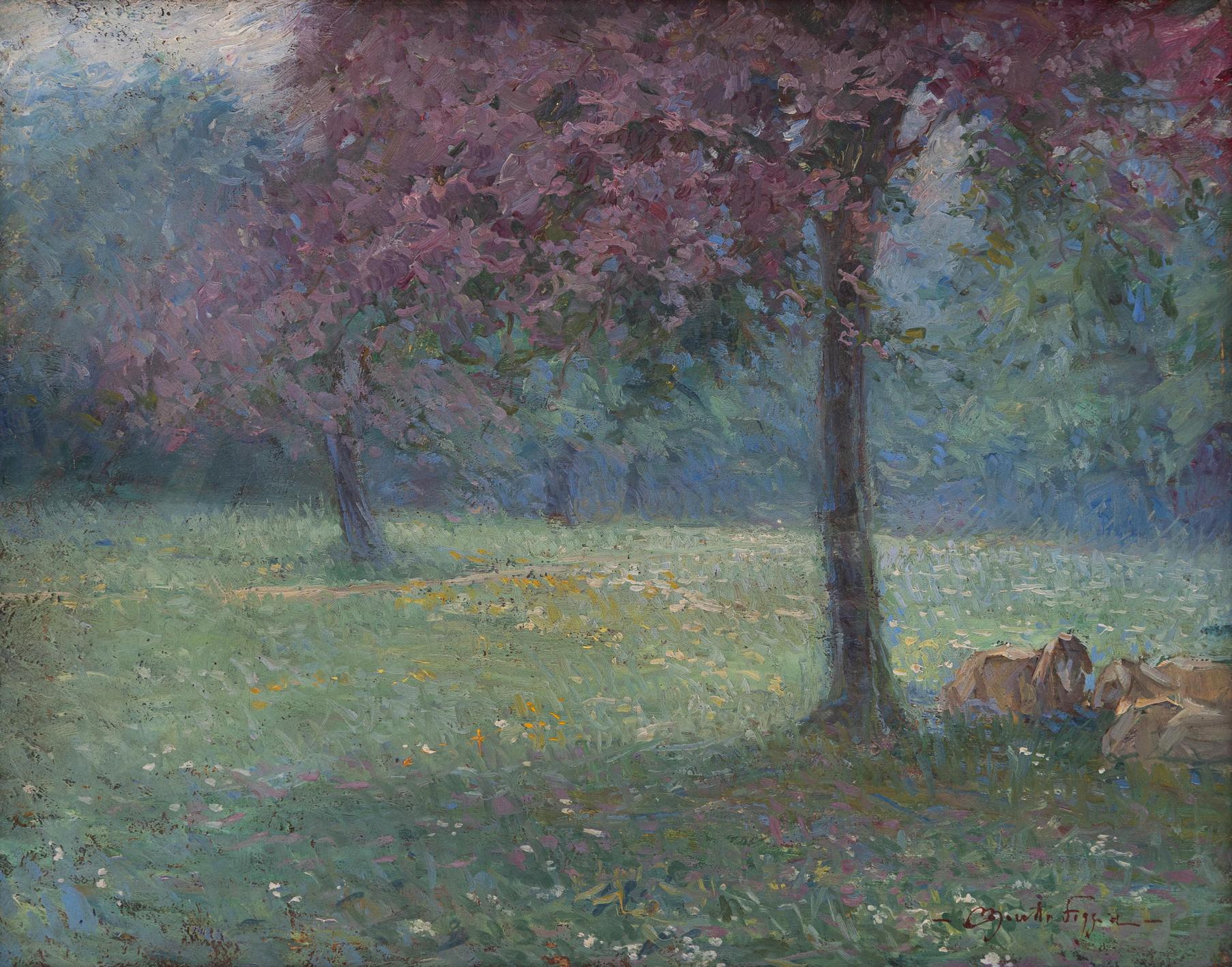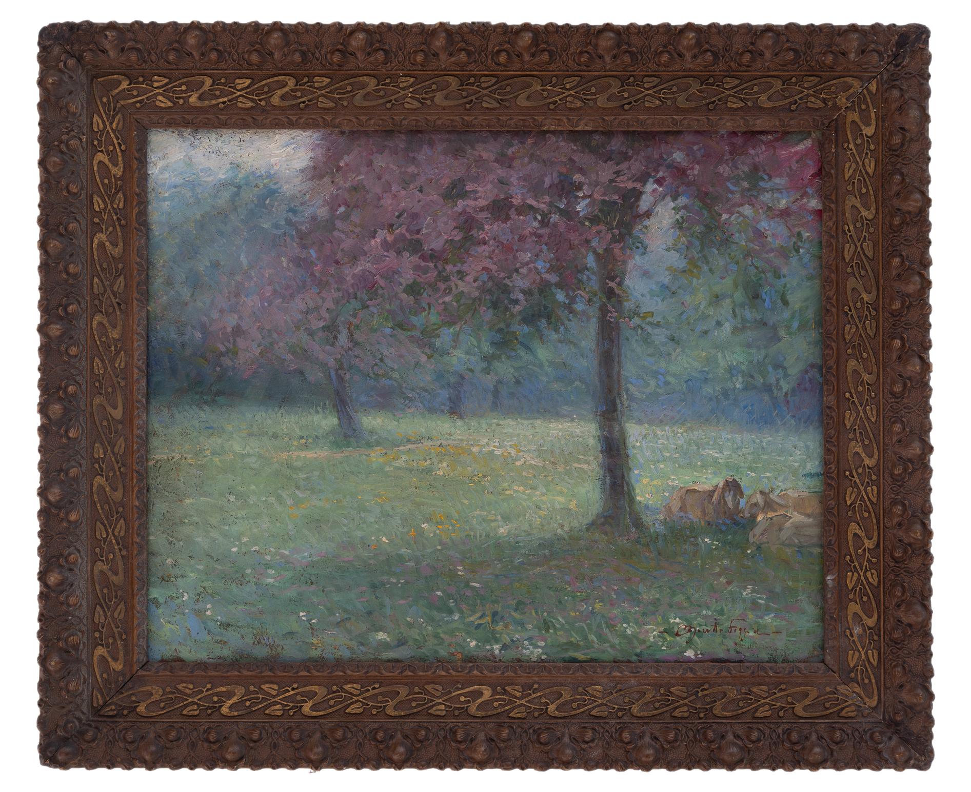 Mario Moretti Foggia - Pascolo all'imbrunire - Mantova 1882 - Pecetto di Macugnaga VB 1954 - Olio su cartone cm 31x40 - Mario Moretti Foggia è stato un rinomato pittore italiano nato il 25 dicembre 1882 a Mantova. La sua formazione artistica lo ha portato ad apprendere presso prestigiose istituzioni, tra cui l'Accademia Cignaroli a Verona e l'Accademia di Brera a Milano. Durante il suo percorso formativo, ha avuto la fortuna di essere istruito da eminenti maestri dell'arte come Mosè Bianchi, Giuseppe Mentessi e Cesare Tallone.Foggia si è distinto come un abile paesaggista e ritrattista, utilizzando varie tecniche pittoriche come olio, tempera, acquarello e fresco per esprimere la sua creatività. Il suo debutto ufficiale nel mondo dell'arte è avvenuto a Milano nel 1902. Nel corso della sua carriera, ha ricevuto numerosi riconoscimenti, tra cui medaglie d'oro all'Esposizione di Mantova per l'insieme delle sue opere nel 1902, a Milano nel 1908 con l'opera "Fratellanza" e a Como nel 1909 grazie al dipinto "Fresca Mattinata". Nel 1925, ha ottenuto il prestigioso Premio Cassani a Milano per il dipinto "L'ora del rosario".Tra il 1920 e il 1926, Foggia ha esposto con successo a Venezia, presentando opere come "Nel cantuccio di Venezia", "Nel Campiello", "Nevicata" e "Compiacenze materne". Nel 1927, a Firenze, in occasione dell'ottantesima Esposizione Nazionale di Palazzo Pitti, ha presentato le opere "Vera" e "Sole invernale". Tra le sue opere più celebri si trova il "Trittico dei Magi" (Ecce sidus, Imus, Adoremus), conservato presso la Galleria d'Arte Moderna di Milano, e "Danza la circassa", esposta presso la Galleria del Palazzo Ducale di Mantova.Le opere di Mario Moretti Foggia sono state incluse in importanti collezioni, tra cui quella del Quirinale, e sono state esposte in gallerie pubbliche e private in Italia, Svizzera, Stati Uniti e America Latina. Foggia era un instancabile viaggiatore, che trascorreva lunghi periodi in Oriente per studiare costumi e paesaggi, le cui ricerche sono state esposte con successo a Londra, Parigi e Bruxelles.Partecipando a numerose mostre collettive nazionali e internazionali, Mario Moretti Foggia ha consolidato la sua reputazione come uno dei pittori più influenti della sua epoca. Nel corso della sua carriera, ha realizzato dieci mostre personali, tutte accolte con entusiasmo da parte di pubblico e critica.Mario Moretti Foggia si è spento nel 1954 a Pecetto di Macugnaga, lasciando dietro di sé un prezioso e duraturo contributo all'arte italiana.