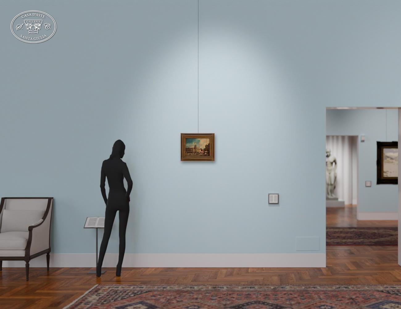 Giuseppe Ponga - Venezia Piazza San Marco - Chioggia 1856 - Venezia 1925 - Olio su tavola cm 23x32 - Giuseppe Ponga (1856-1925) è stato un pittore italiano, nato a Chioggia, noto per la sua abilità nel riprendere la tradizione settecentesca della pittura veneziana. Formatosi all'Accademia di Belle Arti di Venezia, si ispirò ai grandi maestri come Giambattista Tiepolo e Francesco Guardi. Ponga si dedicò a vari ambiti artistici, tra cui la pittura murale, la miniatura e l'acquerello. Tra i suoi lavori più celebri si ricordano le decorazioni del Palazzo del Parlamento di Budapest e quelle del caffè "Quadri" a Venezia, che ornano i portici di Piazza San Marco. La sua capacità di fondere elementi classici con un tocco personale lo ha reso uno degli esponenti di spicco della pittura veneziana del suo tempo.