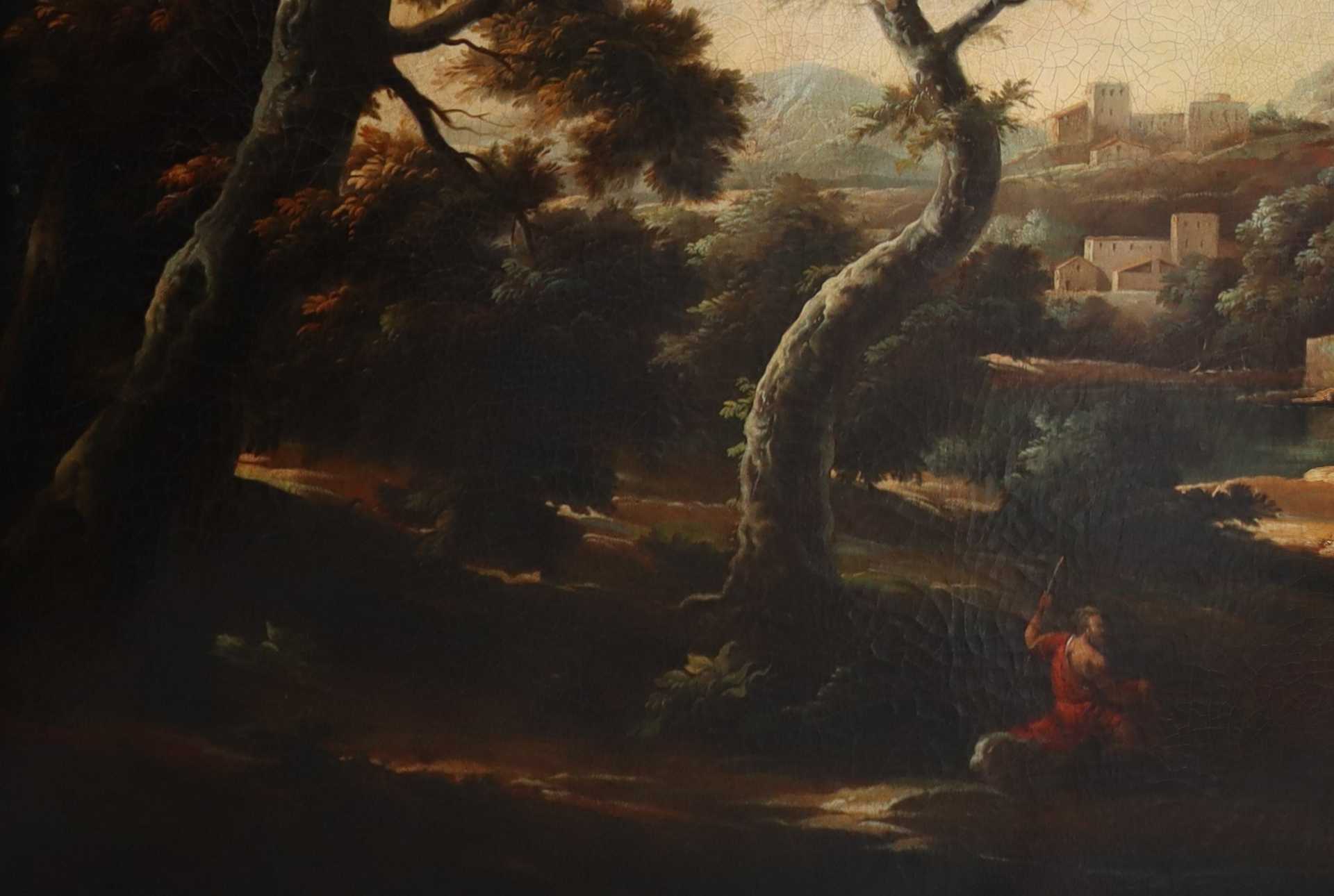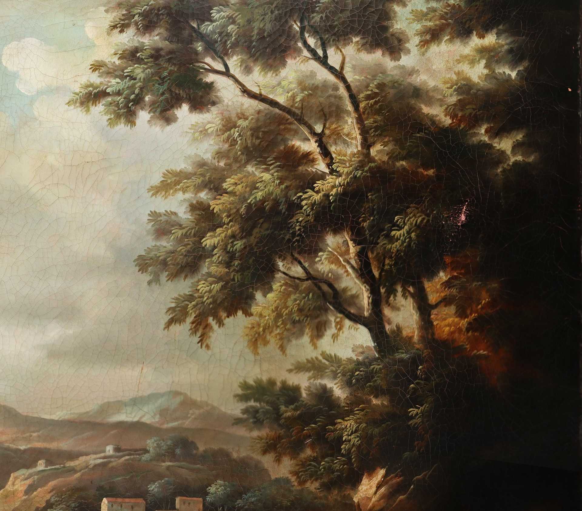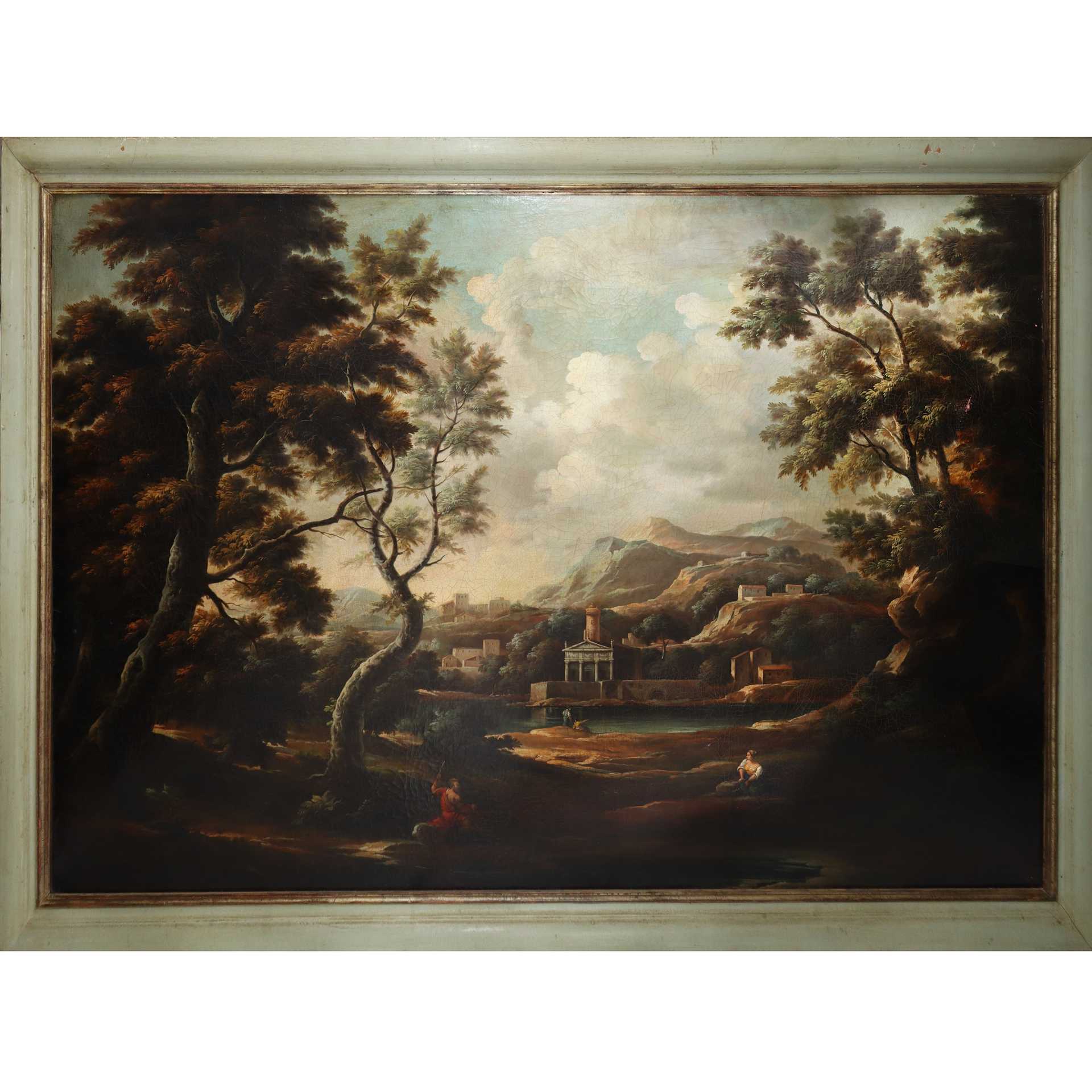 Jan Frans van Bloemen L'Orizzonte (Anversa 1662-Roma 1749) - Paesaggio Valle dell'Arno presso Tivoli H cm 150x200 - in cornice H cm 168x217 Pittore tra i maggiori paesaggisti Van Bloemen in questa opera mostra un paesaggio arcadico di ampio respiro tipico dei dintorni di Roma, attraversato dall'Arno, con personaggi che svolgono attività di vita quotidiana, sullo sfondo un borgo con architetture su una collina.